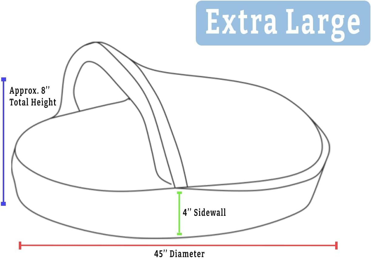 - SIZING: This Extra-Large Cozy Cave has a 45” diameter, a 4” sidewall, and an approximate 8” hood opening. A thin removable plastic tube keeps the hood open for easy entry or exit and can be removed through the small hole at the corner of the hood. This size Extra-Large provides space for larger breeds while creating a snug, enveloping feel. Please scroll down and check our size chart below for our best recommendations based on breed to ensure you buy the right size for your pup.