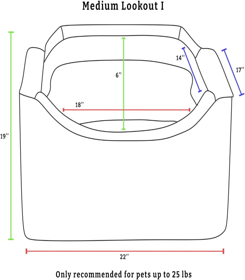 - This dog booster seat for small dogs under 25 lbs raises your pup 6” to allow easy viewing out of the window. The removable pillow can add additional height if necessary. The enveloping microsuede interior is 18” x 14” and boasts 6” tall sidewalls to secure small breed dogs under 17” in length (like pugs, corgis, and dachshunds) within the dog car seat. The Lookout dog car seat measures 19″H x 22″W x 17″L and is an ideal back seat or front seat dog car seat, fitting snugly inside a single seat.