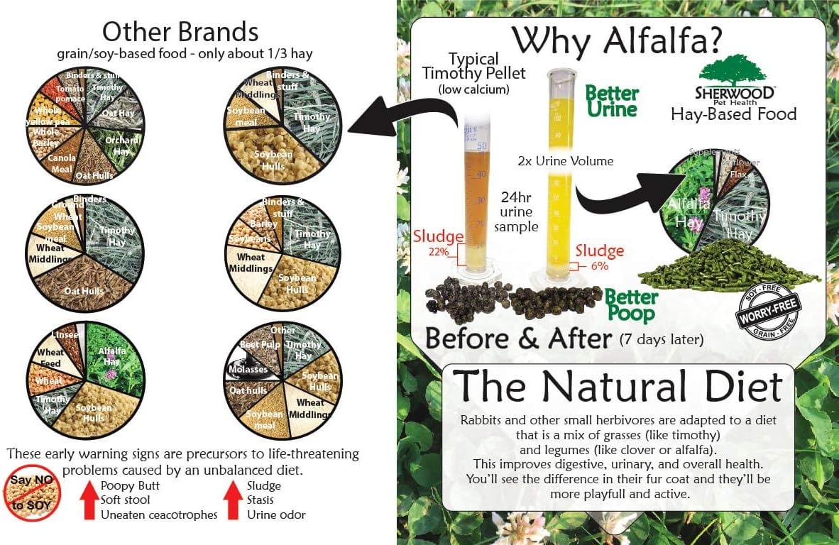- High fiber prebiotics, including: short and long-strand fibers for optimal digestive health and immune health. Switching brands doesn't have to be hard on your rabbits digestion with Sherwood's real hay-based formula for natural great taste and nutrition that is grain and soy-free. No cheap fillers or by-products that take the place of hay (like soybean hulls or rice hulls)