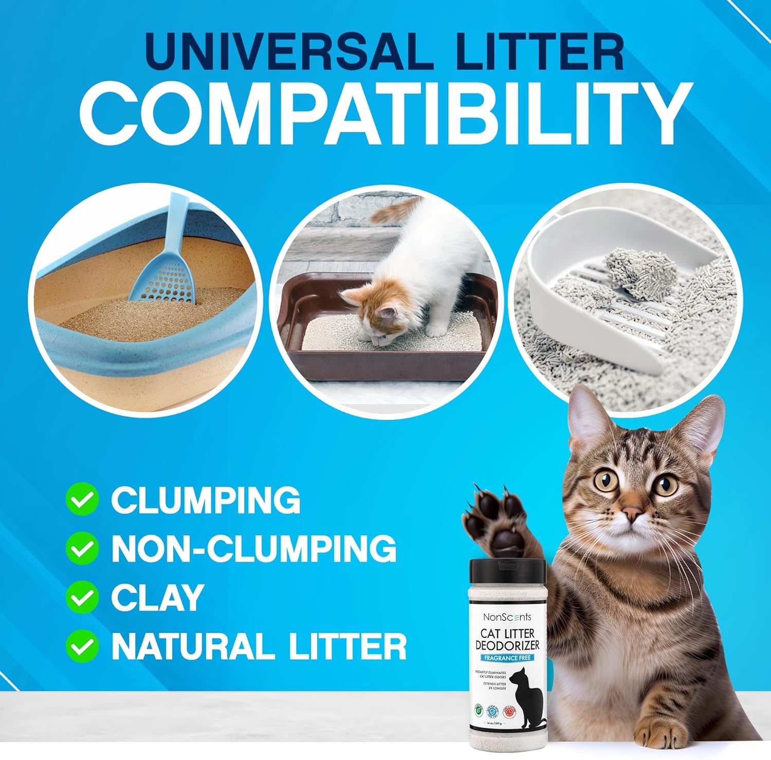 - EXTENDED LITTER LIFE: Save time and money with our deodorizer, which not only eliminates odors but also extends the life of your cat litter. Reducing the need for frequent litter changes results in reduced litter consumption. Compatible with various litter types ensuring efficient moisture-wicking and enabling longer intervals between cleanings.