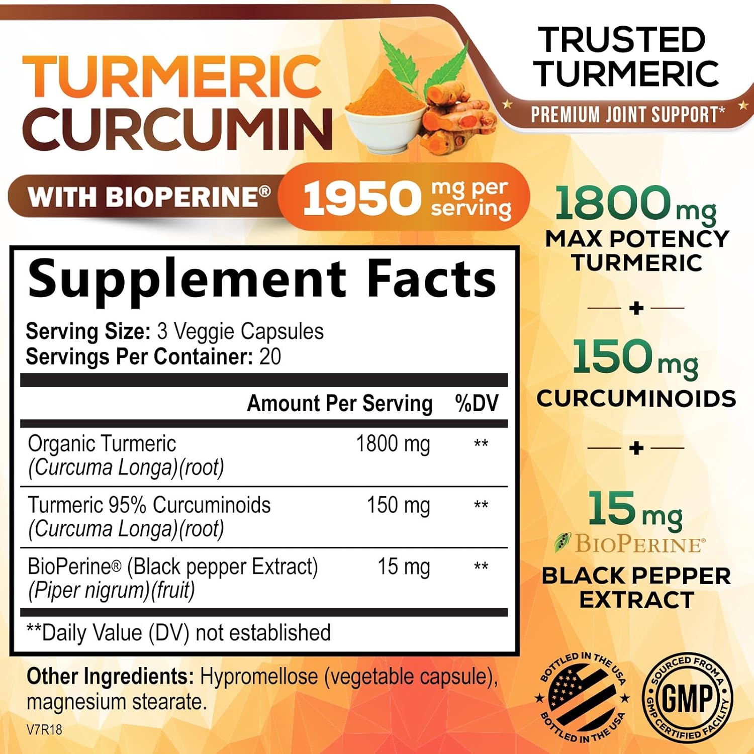 - QUALITY YOU CAN TRUST: Bottled in the USA in a GMP certified facility, these non GMO, vegan friendly turmeric curcumin supplements are carefully tested for purity and safety; Our easy to swallow turmeric capsule formula is one of the most trusted tumeric supplements and curcumin with black pepper products available today