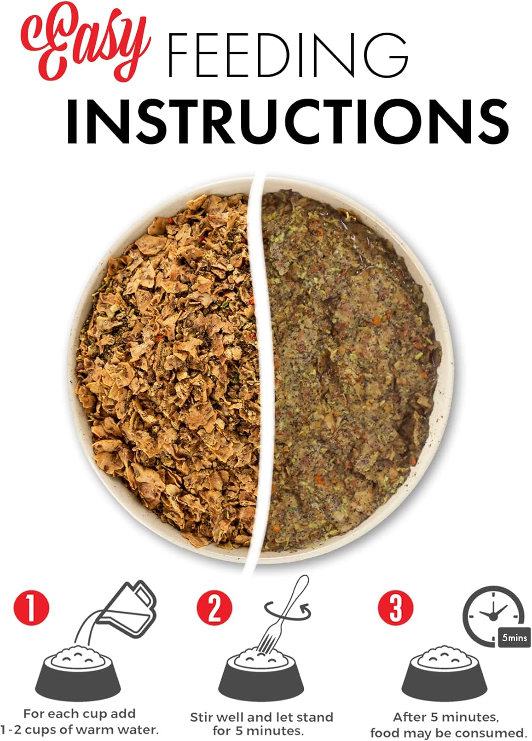 - JUST ADD WATER - For each cup of dog food add 1-2 cups of warm water. Stir well and let stand for 3-5 minutes