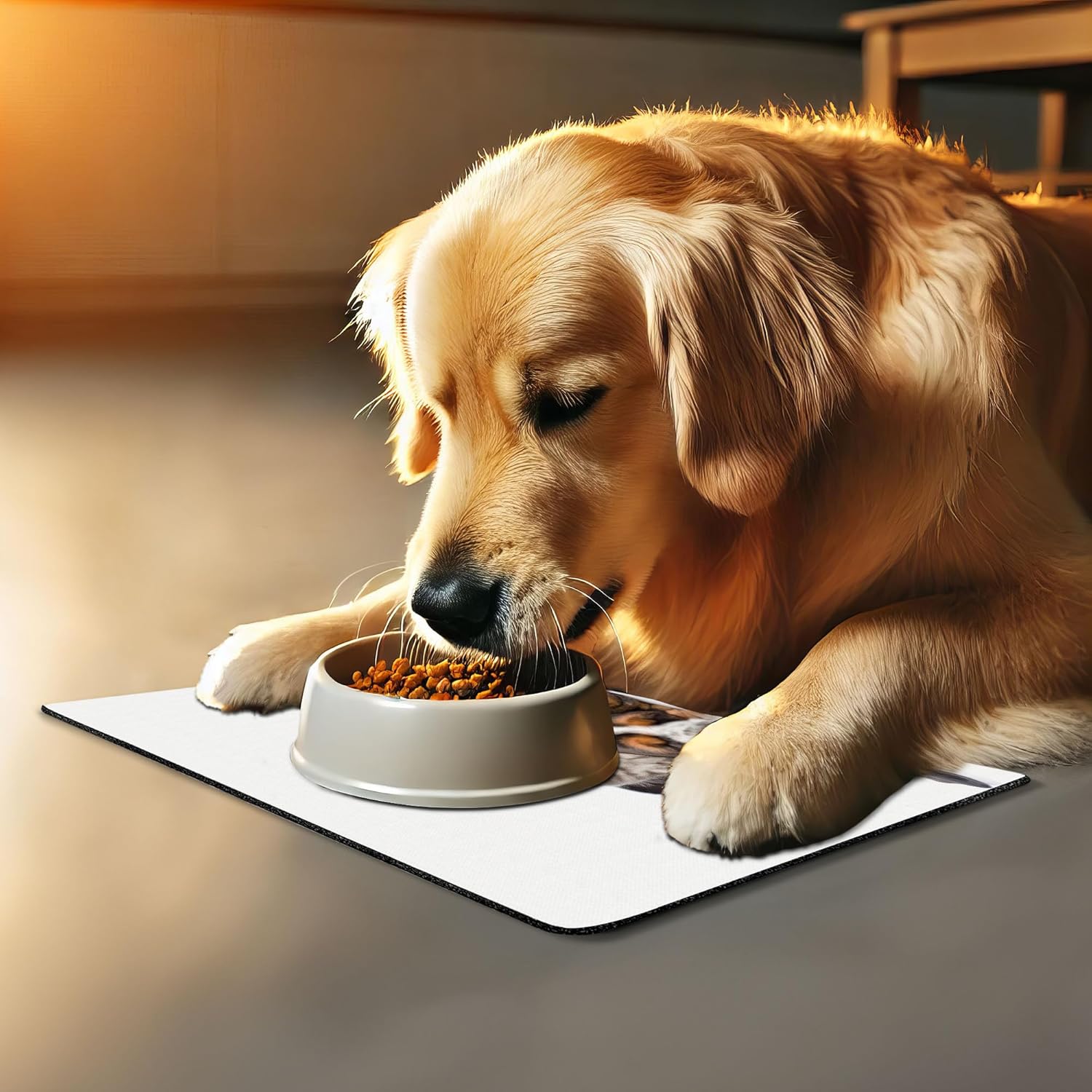 - Features - Fun prints and long-lasting colors. Find any theme and color you want to match your room decor or your pet’s personality. This pet feeding mat can even feature your cat's or dog’s favorite item or design, adding a cheerful touch to your pet’s feeding area.