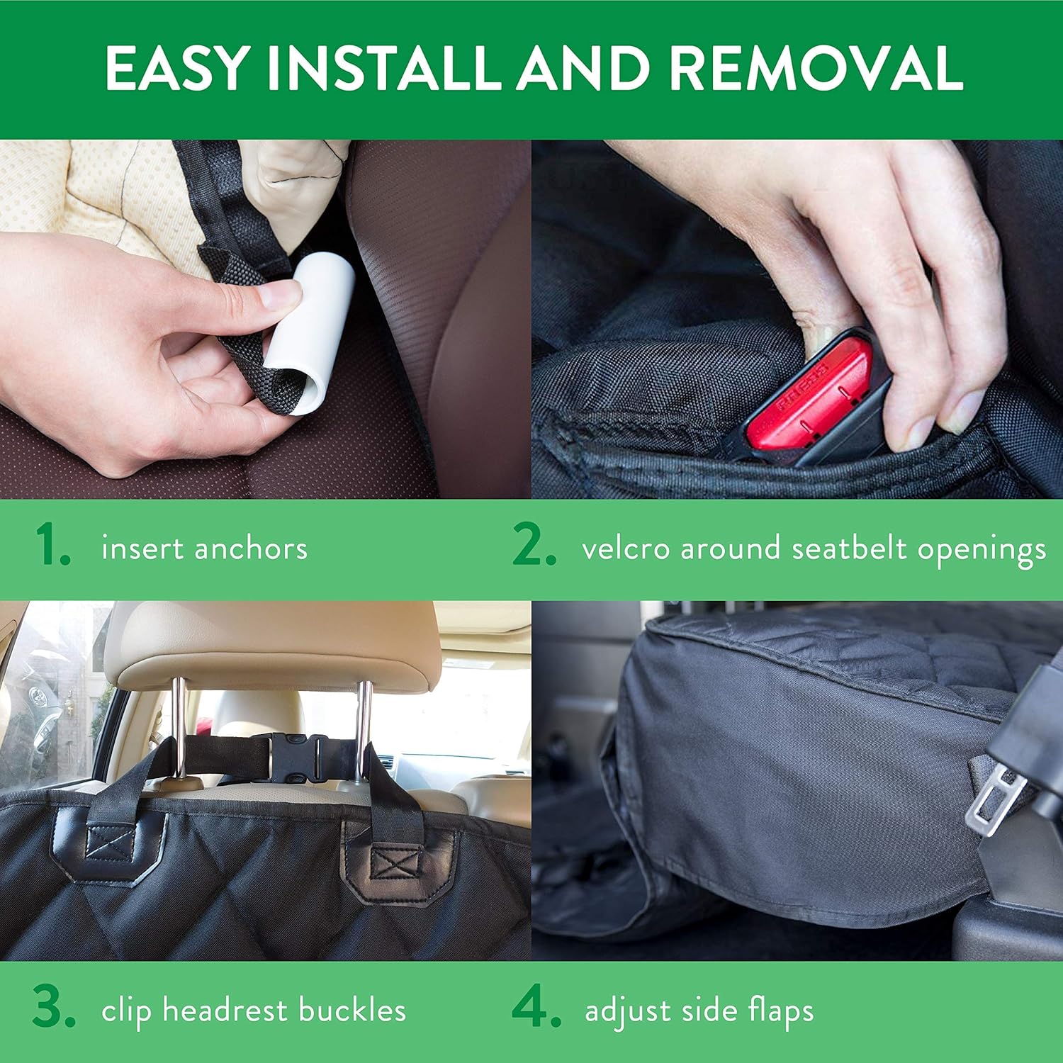- πππ¦π¬ π§π’ ππ‘π¦π§πππ: This back seat car cover comes in various sizes, REGULAR - 55''W X 60''L / EXTRA LARGE - 63''W X 68''L / BOTH HAVE - 9'' X 18'' SIDE FLAPS. This elastic skirt and adjustable back and headrest straps provide a seamless clean look and snug fit. Buckle the dog car seat protector to your back seat using the adjustable back strap and insert the seat anchors to secure the cover in place. The headrest strap fits most vehicles