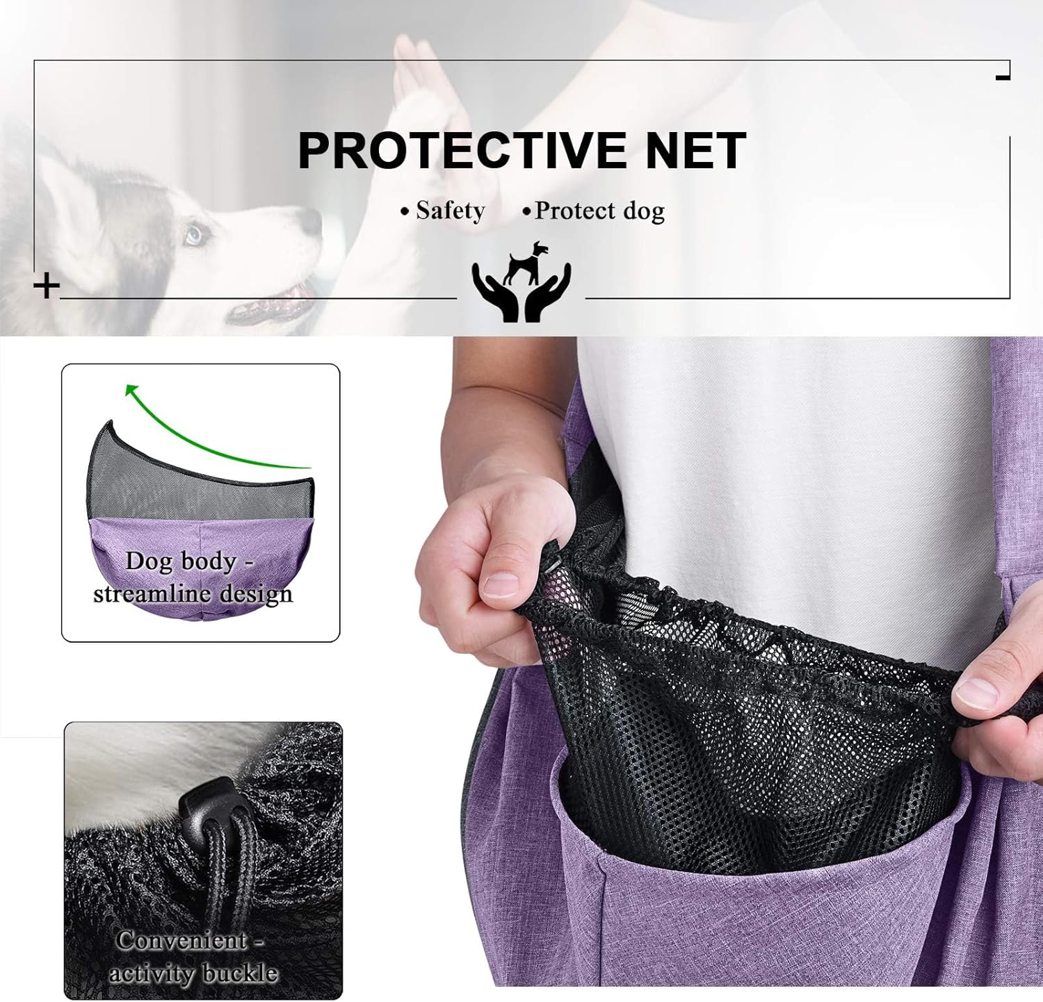 - Double protection device for safety buckle and safety mesh . The front of the mesh is short and the back is long. The design conforms to the body shape of the pet, making it more comfortable and secure. It can effectively prevent the dog from jumping out. To prevent the buckle from slipping, we can make a slip knot behind the buckle after the opening is closed.