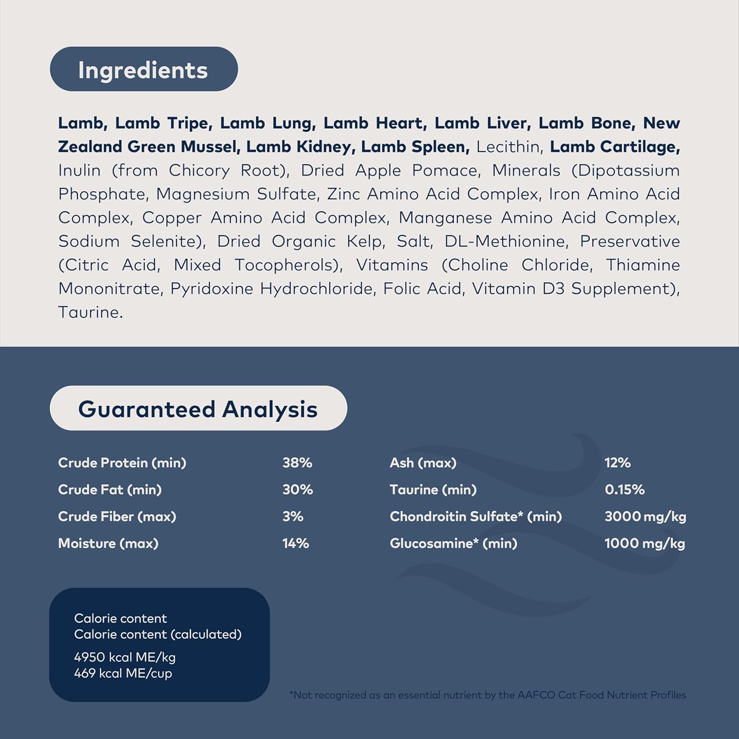 - HIGH PROTEIN, NUTRIENT DENSE: Featuring 96% free-range Lamb, Organs, Bone, and New Zealand Green Mussels, this grain-free cat food delivers nutrition with a mouth-watering taste for all cats. Gentle air dried processing retains the goodness of the raw ingredients. This food supports indoor cat food needs and is perfect for all life stages, from kitten food to senior cats.