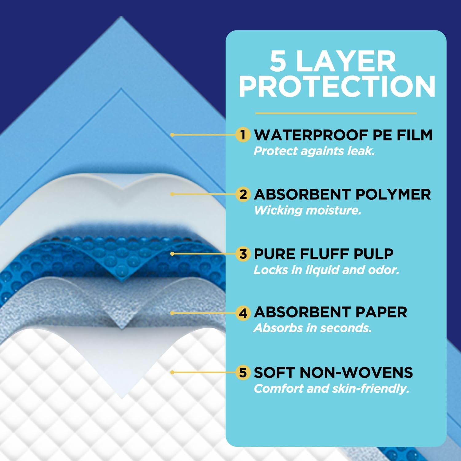 - β Super Absorbing System---Mix imported fluff pulp and SAP factor,absorbent quickly lock in fluids and help prevent odor. soaking up 1300ml to 1700ml of water per bed mat.keeping liquid away from skin to promote sound sleep and peace of mind for adults or children.