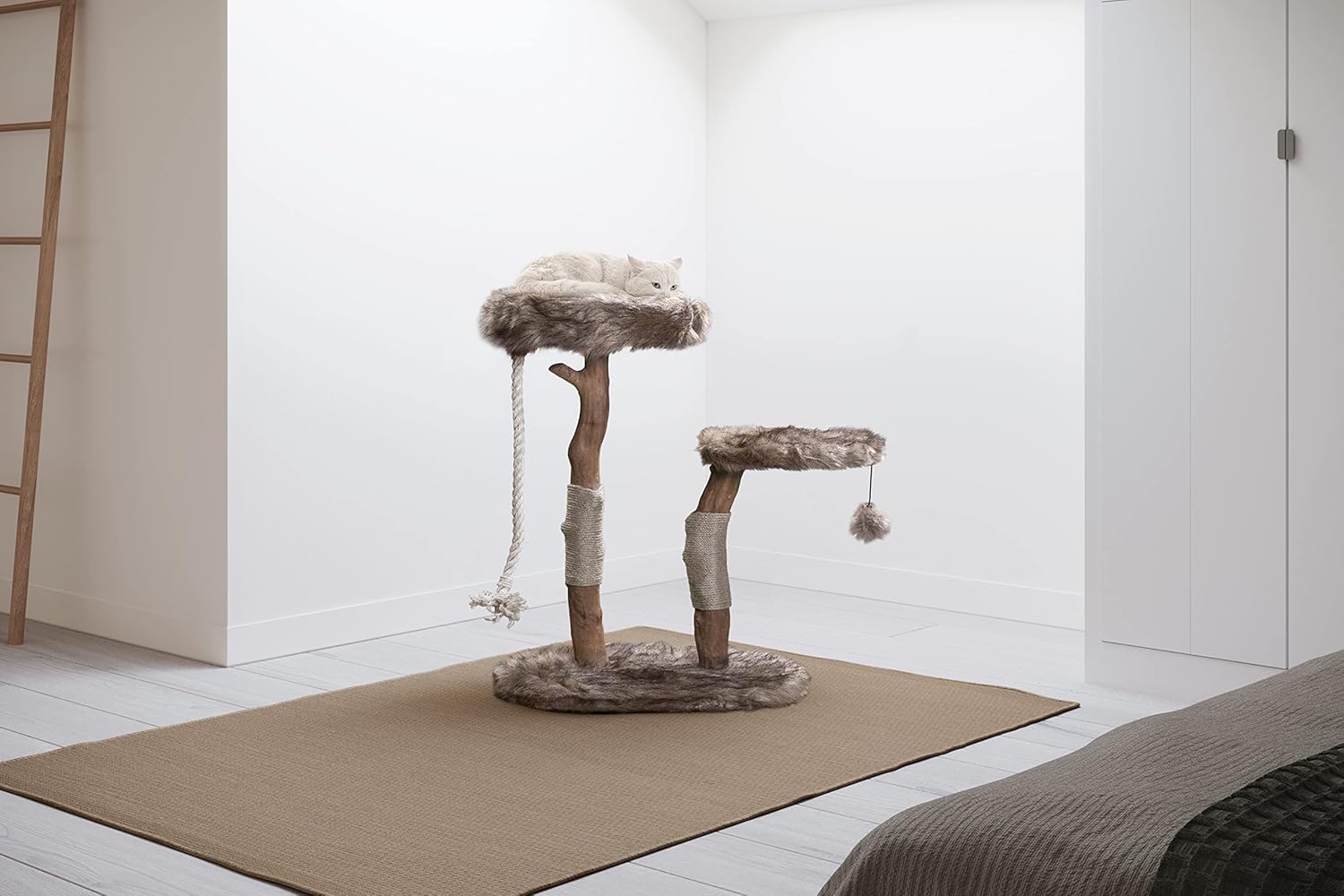- BEAUTIFUL & UNIQUE DESIGN: Unlike most cat furniture, this wooden cat tree tower will enhance the look of your home. It includes two beautifully crafted, one of a kind trunks that hold a faux fur covered platform and an extremely comfortable bolstered bed. It is perfect for your kitty to have a glorious time napping while you can enjoy looking at a beautiful piece of art that adds to your homes aesthetics.