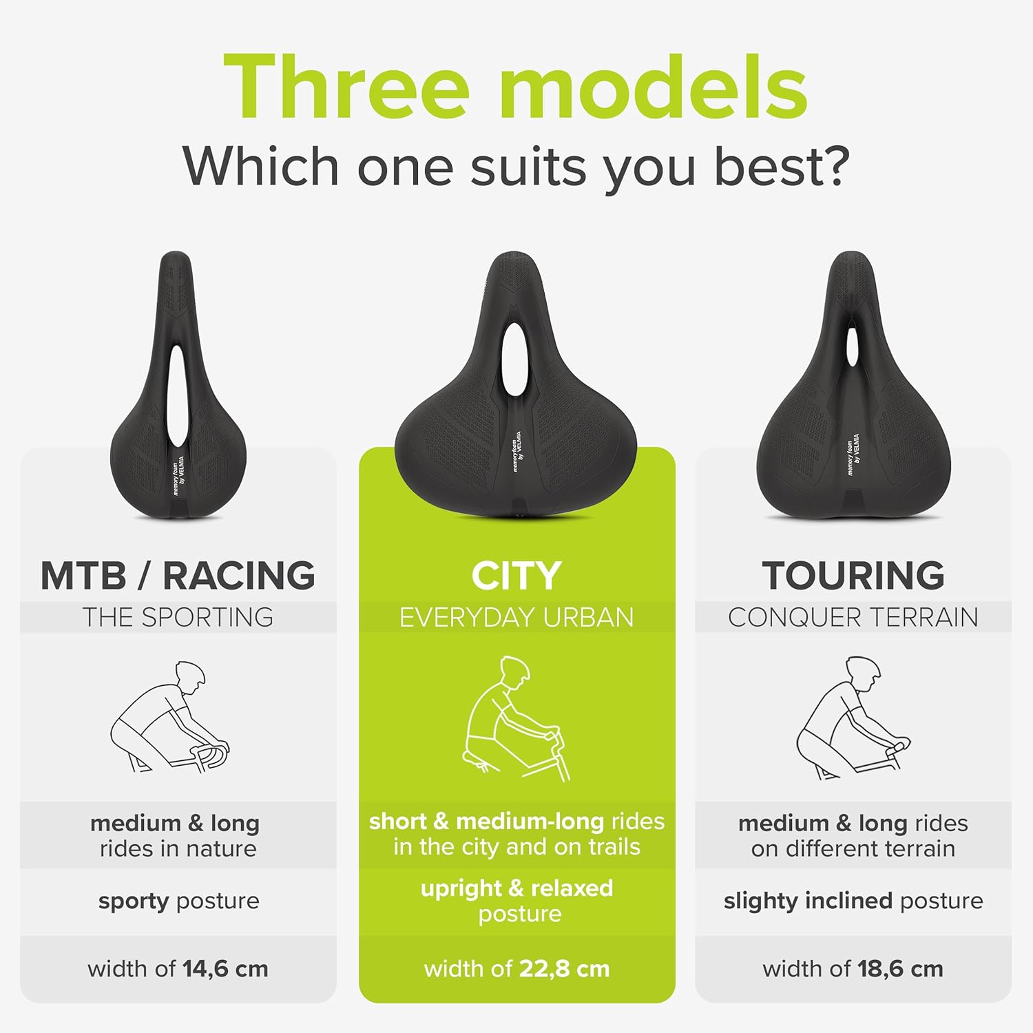 - MADE FOR YOUR RIDING POSITION - There are three specific models of the bicycle saddle, so you can choose the Velmia bike seat depending on your individual riding position and riding style needs!
