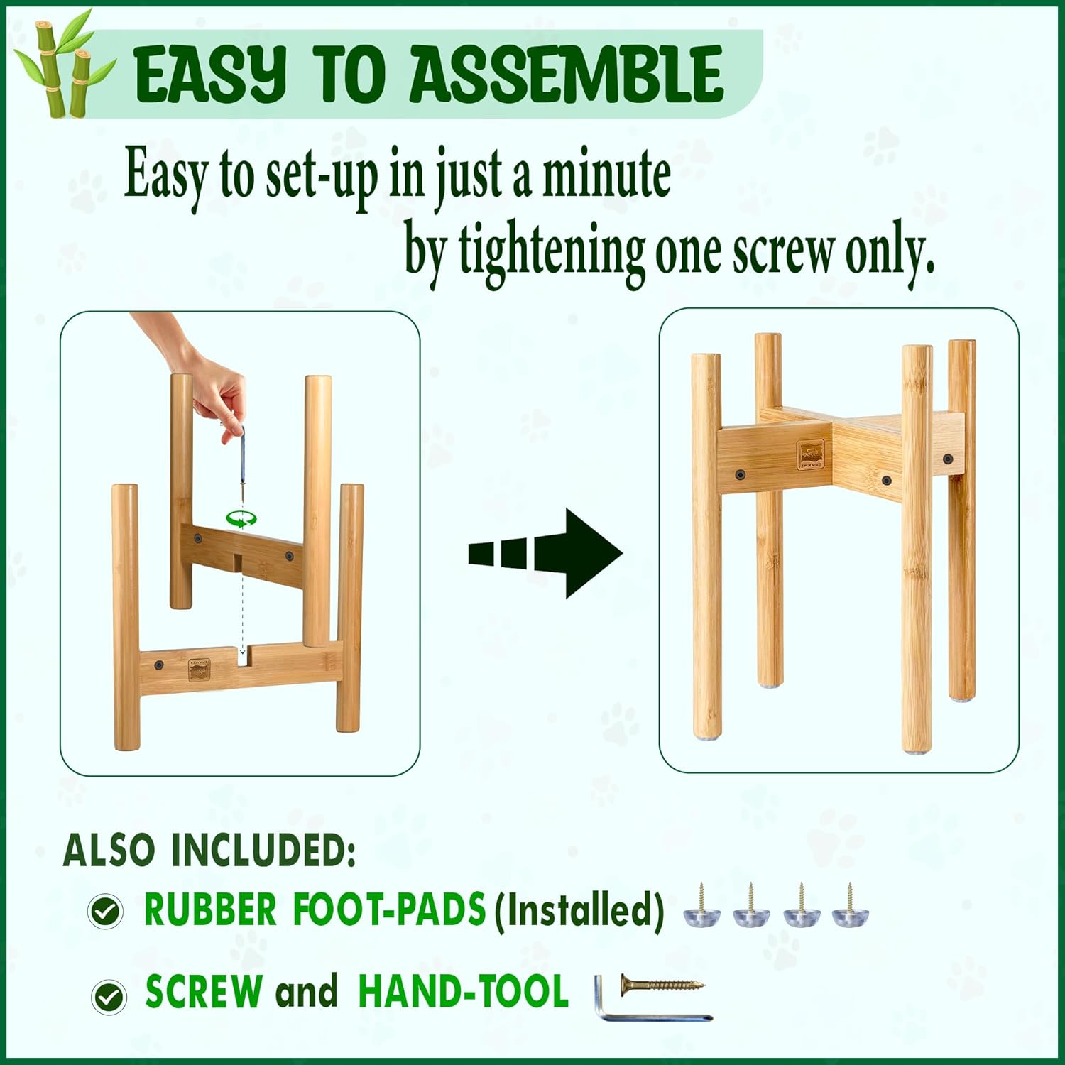 Dog Bowl Stand for Large Breed - 14-inch High, Adjustable Sideways to Fit Various Sizes of Pet Food/Water Bowls, Slow Feeders, and Drink Fountains - Bamboo