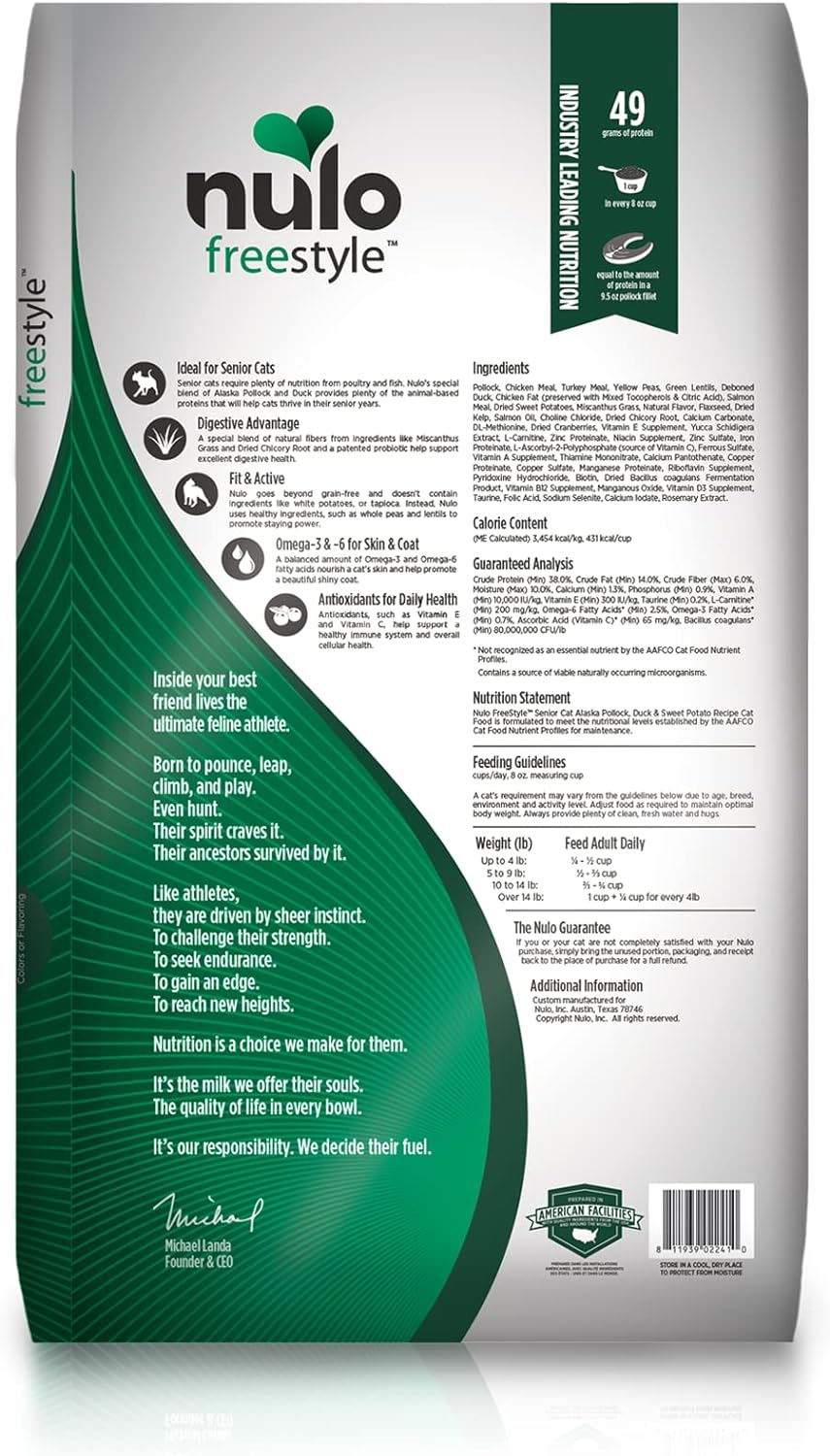 Nulo FreeStyle High Protein Senior Cat Food, Alaska Pollock & Sweet Potato Recipe - Natural Grain-Free Dry Cat Food for Seniors with L-carnitine, Omega Fatty Acids, & Probiotics, 4 lb Bag