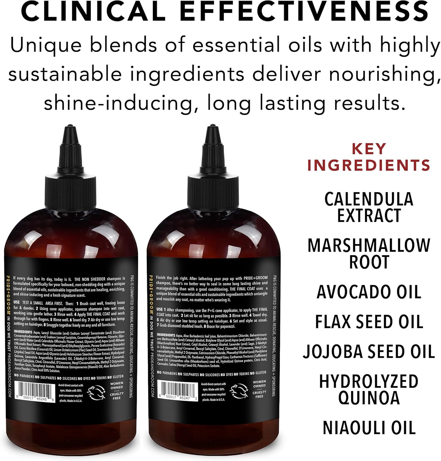 - PRIDE+GROOM BOX SET: Beautiful gift box that includes THE NON SHEDDER shampoo and THE FINAL COAT conditioner packed with essential oils & smoothing ingredients for a non shedder’s hair coat.