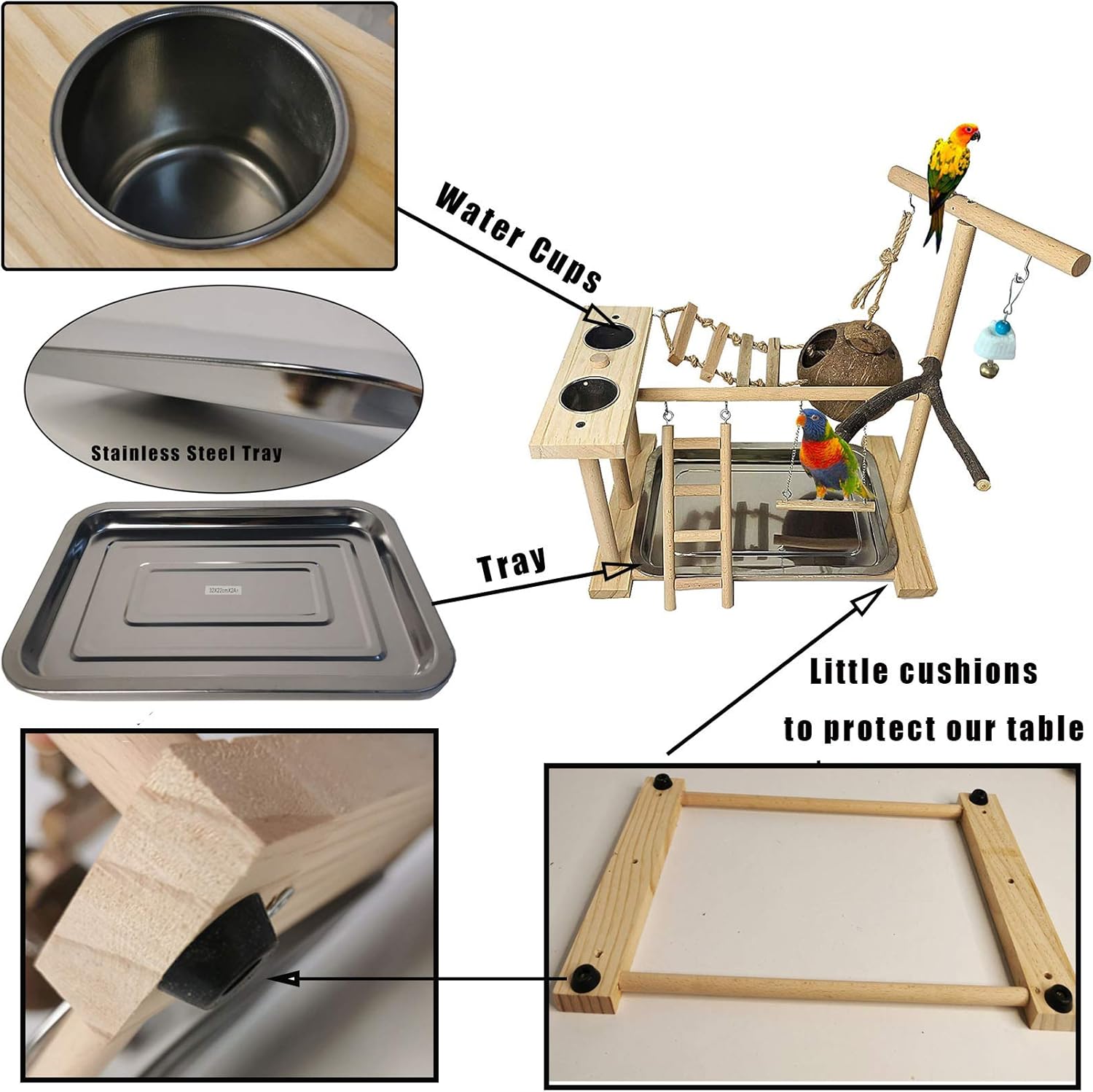 - HAVE A FUN BIRD PLAY GROUND: Package includes all the parts of bird stand, including screws, a tray, toy, water cups. Besides, we put a little screwdriver in the package for assembling it. You can refer to this data before you buy it to see if it is suitable for your birds. PLZ NOTE the size dimension, if your birds are too big, please choose our other larger wooden stand