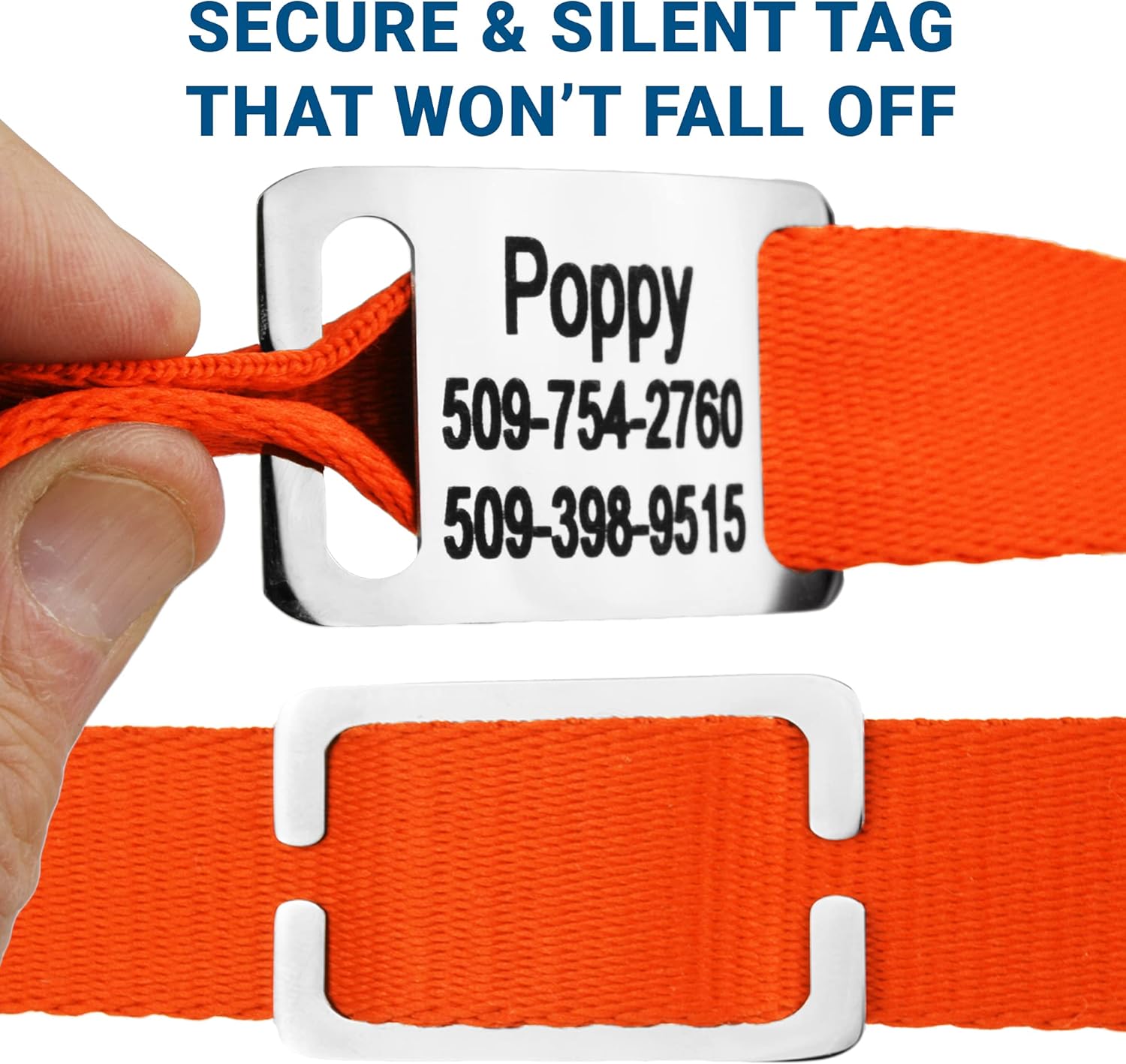 GoTags Personalized Dog Collar with Nameplate, Adjustable Dog Collar with Custom Engraved Slide On Pet ID Tag in Stainless Steel, Silent, No Noise Dog Tag for Large Medium and Small (Orange, Large)