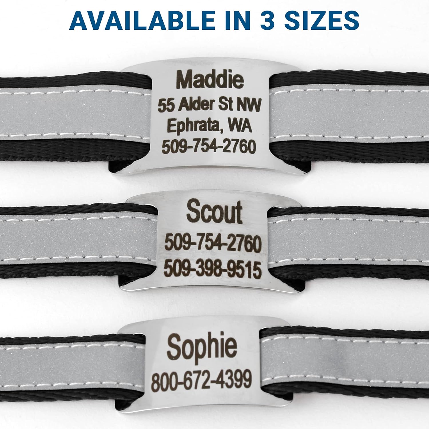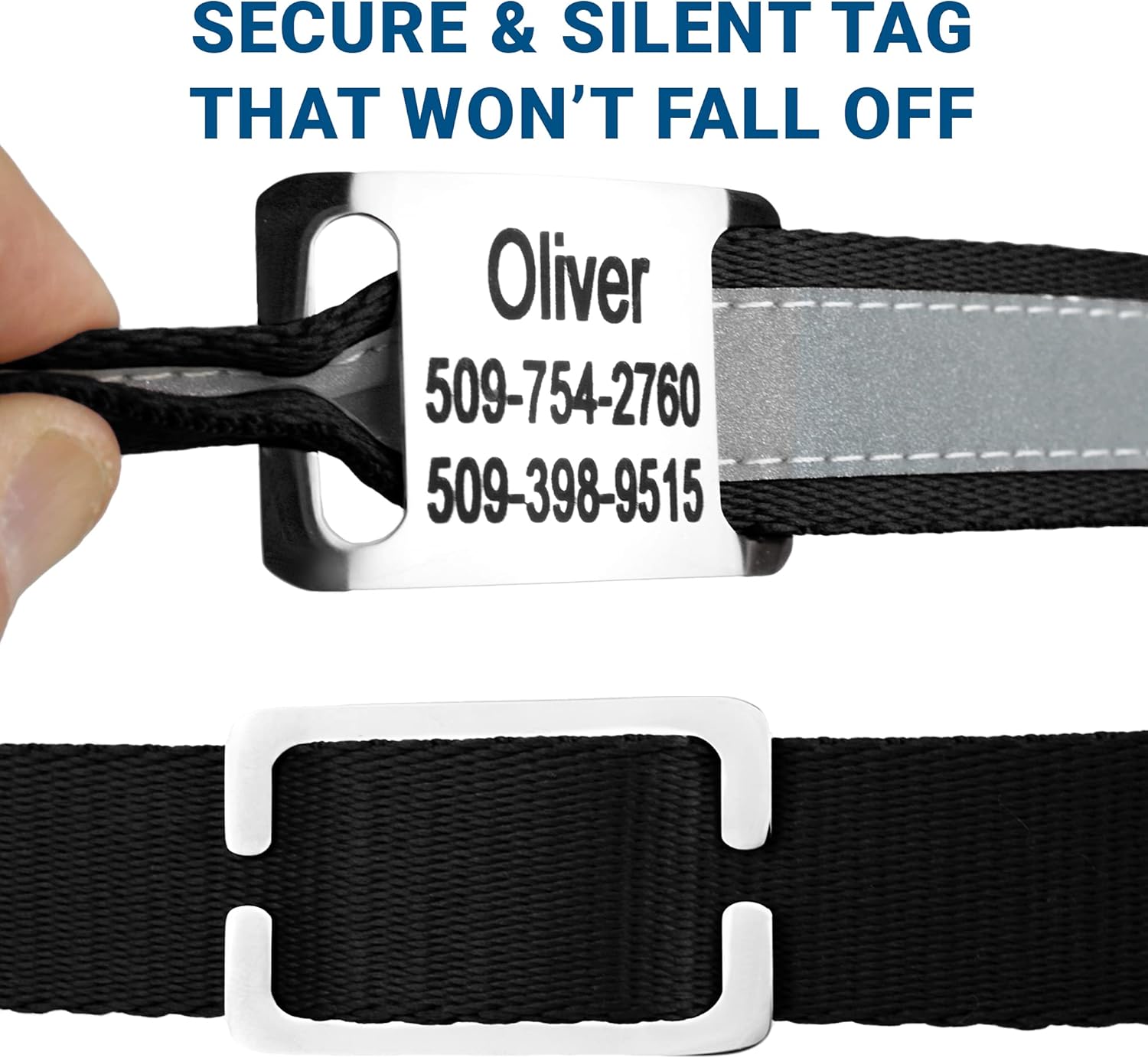 GoTags Reflective Personalized Dog Collar with Nameplate, Adjustable Dog Collar with Custom Engraved Steel Slide On Pet ID Tag, Silent, No Noise Dog Tag for Large Medium or Small (Black, Large)
