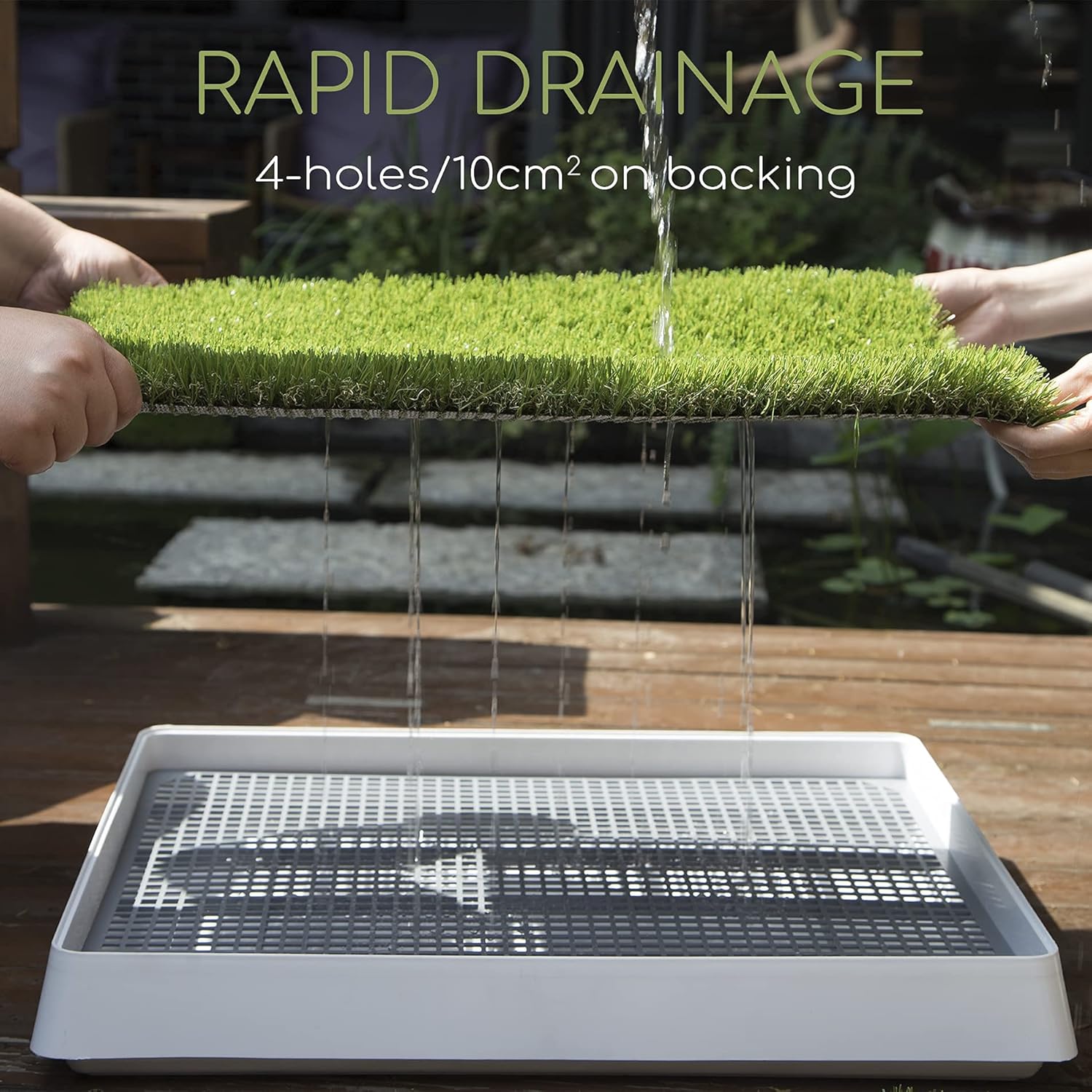 - RAPID URINE DRAINING! Engineered with 4 drainage holes per 10cm sq for super fast removal of urine through turf to lower drip tray, for quick, easy emptying outdoors. Simply blast with a garden hose or soak with disinfectant for fresh, clean household use!