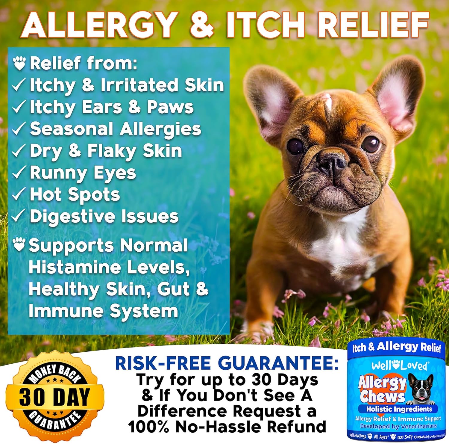 - Dog Allergy Relief - Well Loved Allergy Chews are a veterinarian recommended dog itchy skin treatment which provide dog anti itch relief and allergy support. It's a safe and effective dog hot spot treatment that calms irritated dog dry skin, itchy ears, red and water eyes caused from occasional or seasonal dog allergies.