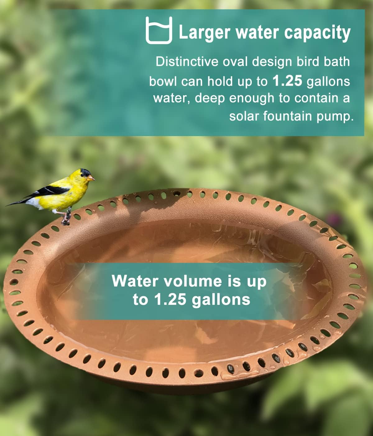 - More capacity & Oblong shape: This extra-large bird bath has an OBLONG tray with small holes along the edges, providing a stable standing and resting environment for the lovely bird friends. Bird friendly color--Chocolate color basin is gentle and unobtrusive in your outside areas, and deep enough for contain a solar fountain pump. (Bowl dimension: 17.2โ L ร 13.2โ W, bowl depth: 2.76 inches.)