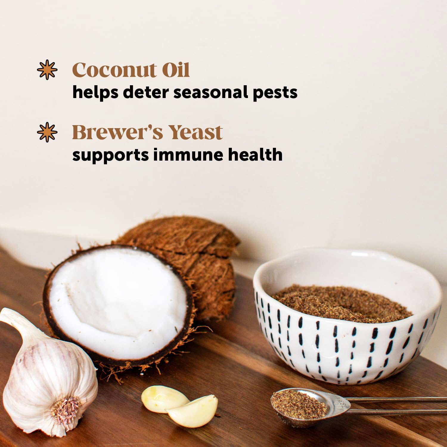 - THE GREATER OUTDOORS - Because of whatâs inside our flea & tick chewables, your pupâs gonna love going outside even more. We make our natural flea and tick chews with wholesome ingredients like coconut oil that contains fatty acids to help deter seasonal critters, brewerâs yeast to support immune system health, & garlic, to help keep fleas, ticks & other unwanted creepy crawlies at bay. This isnât just flea & tick prevention, itâs a healthier way to provide resistance to pests.