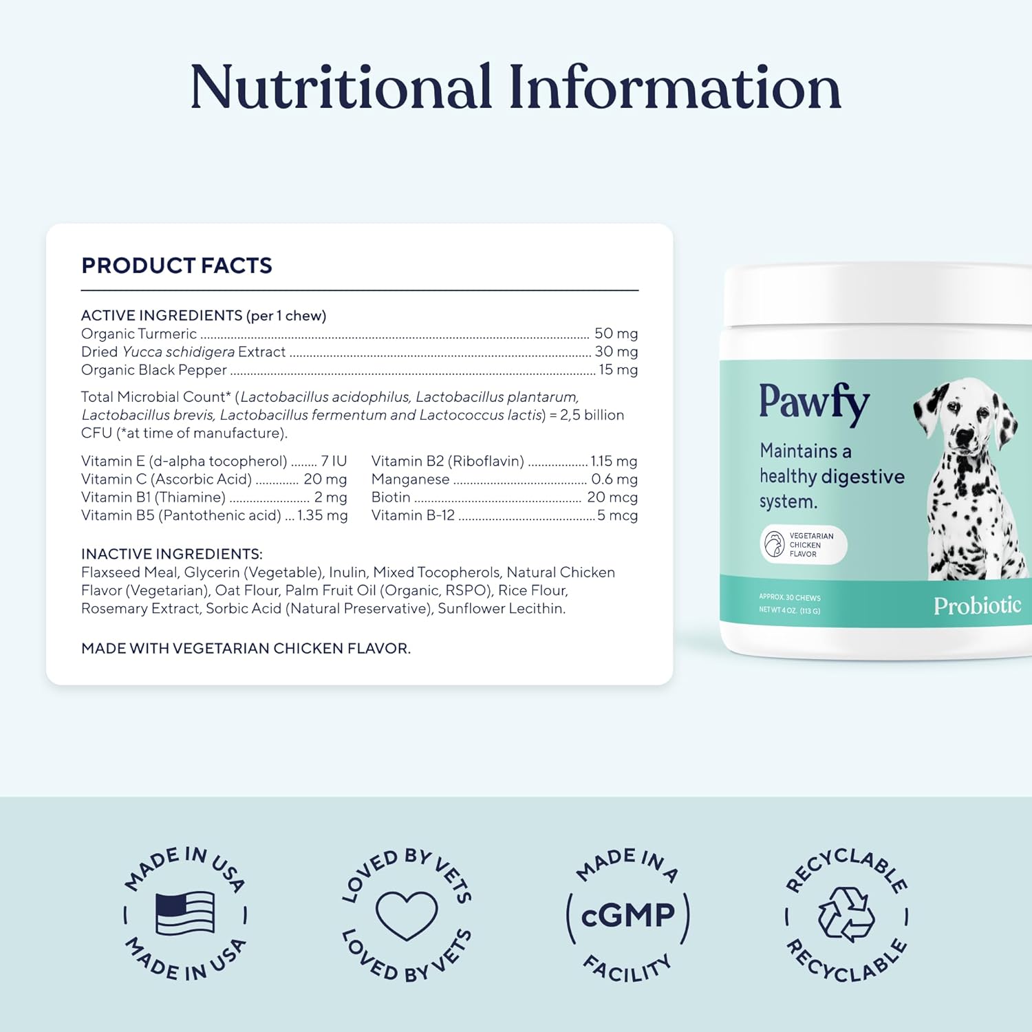 Pawfy Probiotics for Dogs | Supports Digestive Health, Diarrhea for Small, Large Dogs | Improves Gut Health | Anti Yeast Supplements | Skin Health Seasonal Allergies Support - 30 Chews (Chicken)