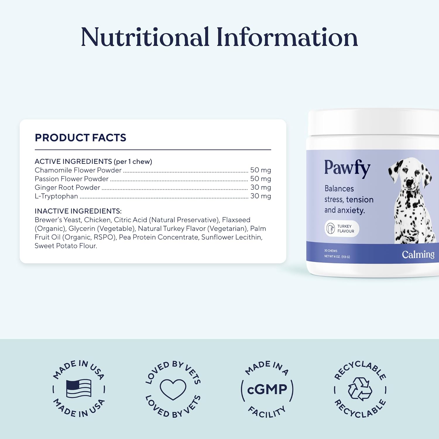 - PROFESSIONALLY TRUSTED INGRIDIENTS: Crafted with care, Pawfy chews feature ingredients selected for their calming support for dogs. Our thoughtful formula is designed to promote relaxation and ease during stressful moments, offering a premium choice for your pet's comfort and well-being.