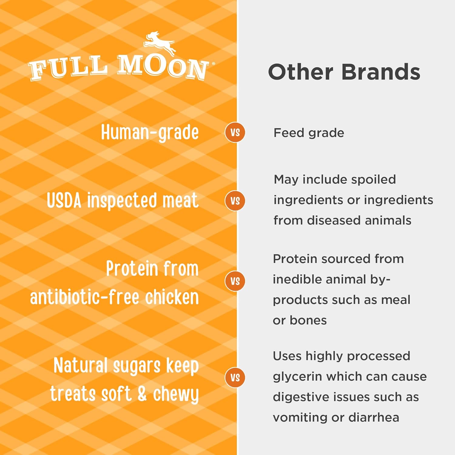 - U.S-GROWN CHICKEN: Full Moon treats are proudly made in the United States using regionally sourced ingredients, including USDA approved, antibiotic-free chicken; No Antibiotics Ever Chicken