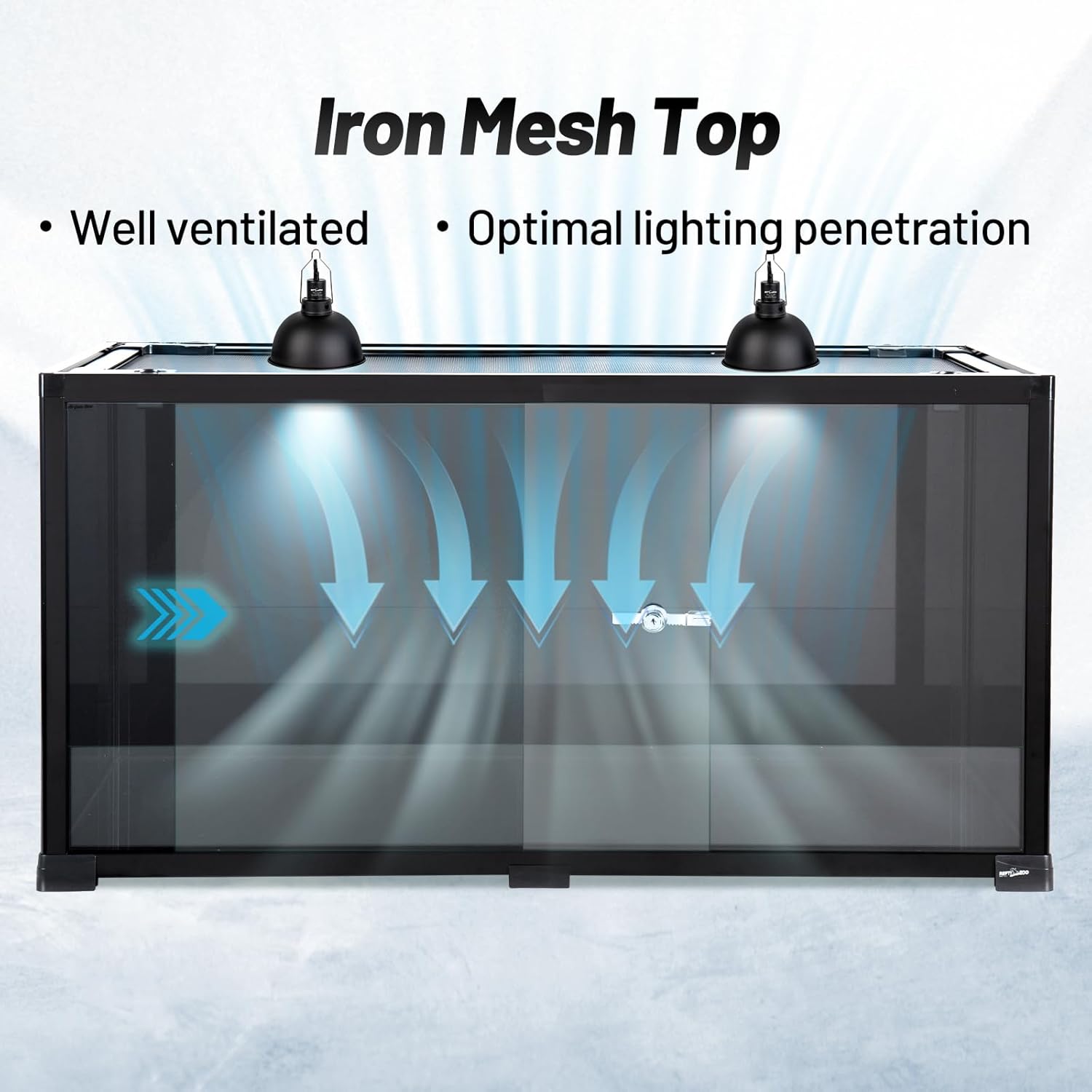 - ăGOOD VENTILATION AND UVB/HEAT IRRADIATIONăScreen top provides ventilation and allows uvb and infrared penetration. Front sliding doors can open easily to feed your pet and prevent escape with the secure lock.