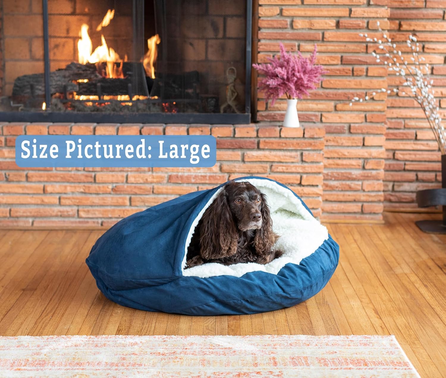 - LIKE A HUG FOR YOUR DOG! Is your dog a cuddler? A burrower? The Cozy Cave dog bed is just what you’re looking for! The hooded dog bed design lets your dog snooze between layers of soft Sherpa lining for enveloped comfort and coziness. Made to appeal to a dog’s natural instincts for burrowing, the Cozy Cave is the best dog bed for dogs who love sleeping under blankets. The Cozy Cave gives them a place to relax with a feeling of safety and security for less anxiety and more restful sleep.