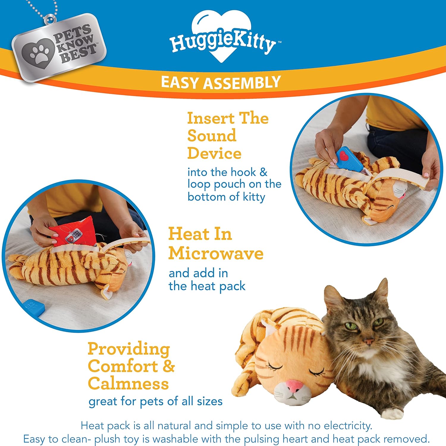 - REUSABLE HEATING PACK: All-natural and microwaveable with no electricity needed; Easily reheat and insert into the pouch into the bottom hook & loop of HuggieKitty for soothing warmth and realistic companion cuddling your pet can enjoy again & again.