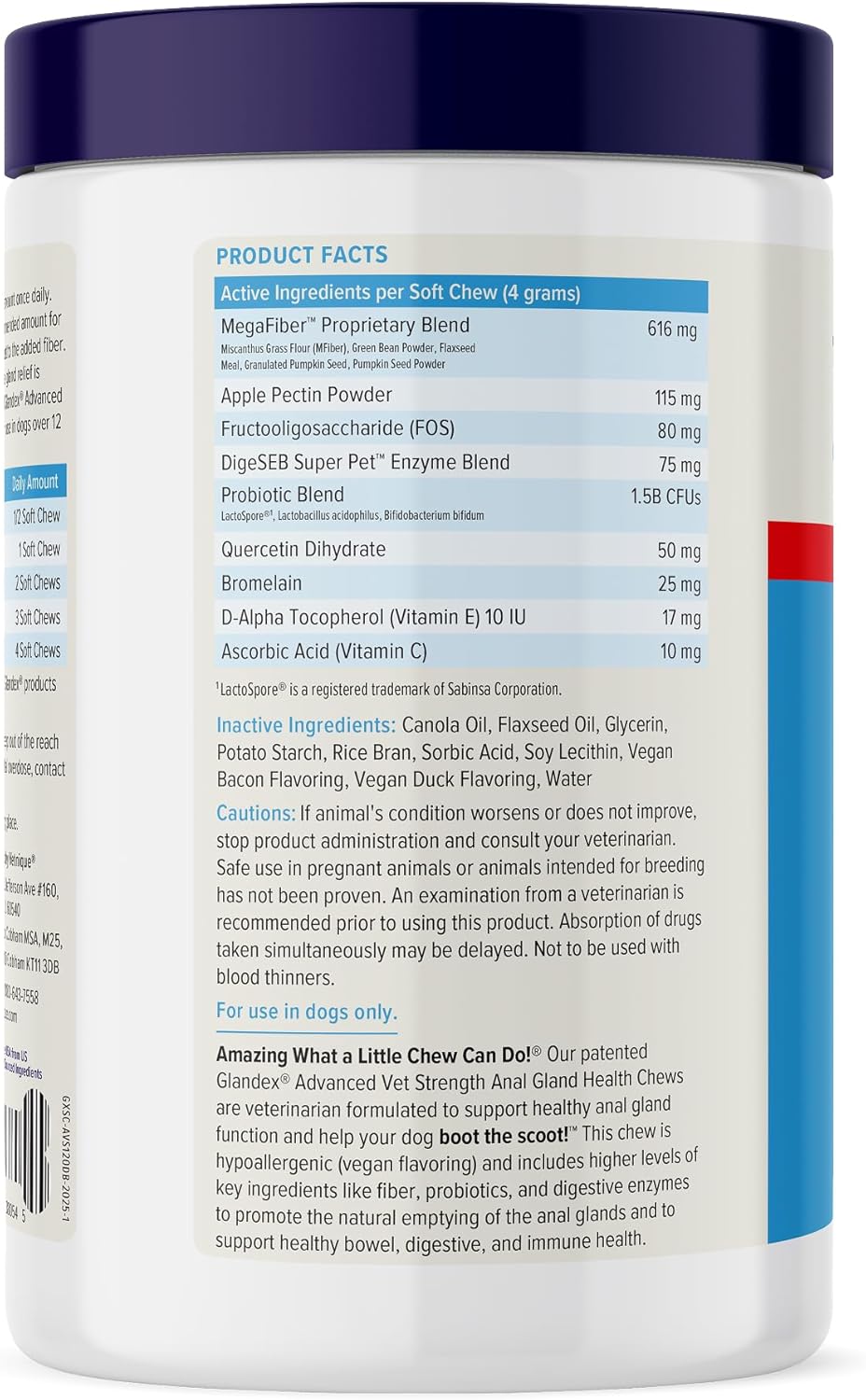 - VET STRENGTH ANAL GLAND & DIGESTIVE SUPPORT: Glandex for dogs is scientifically formulated to support healhy anal glands with Fiber, Probiotics, and more to promote digestive health and to bulk and firm dog stools. (PACKAGING MAY VARY)