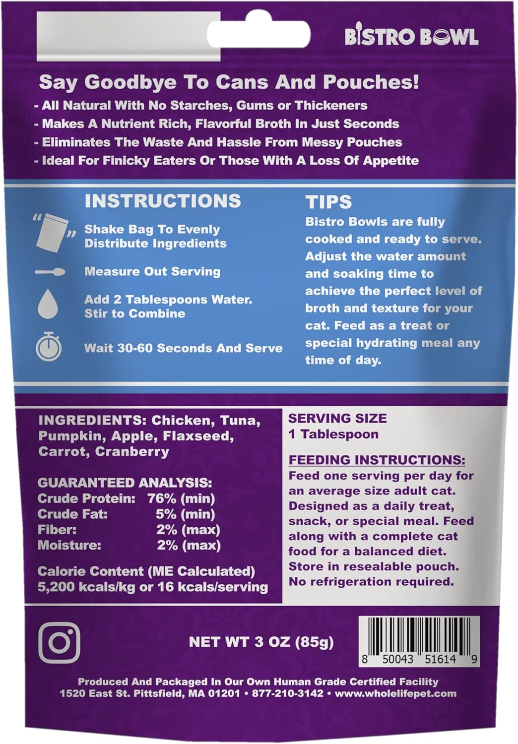 - SAY GOODBYE TO MESSY MEALS: Tired of wrestling with cat food broth pouches? With Whole Life Pet Bistro Bowls, just add water for an instant, lickable cat food topper that keeps your furbaby hydrated, happy, and hungry-no-more.