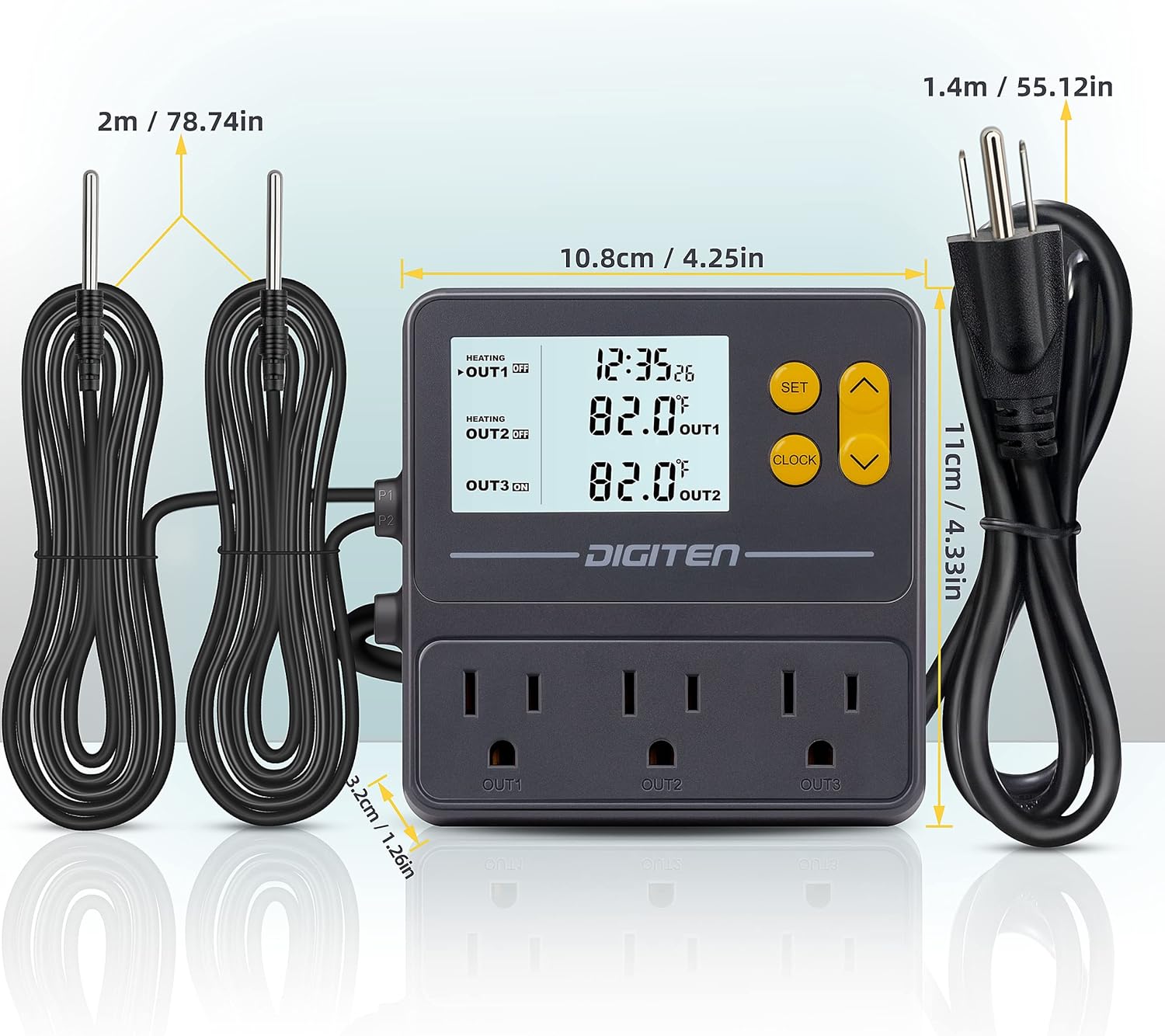 DIGITEN Reptile Temperature Controller with Timer Day-Night,3-Stage Outlet Thermostat Cooling Heating Mode Temperature Controlled for Ball Pythons,Mushroom,Fermentation,Bearded Dragon