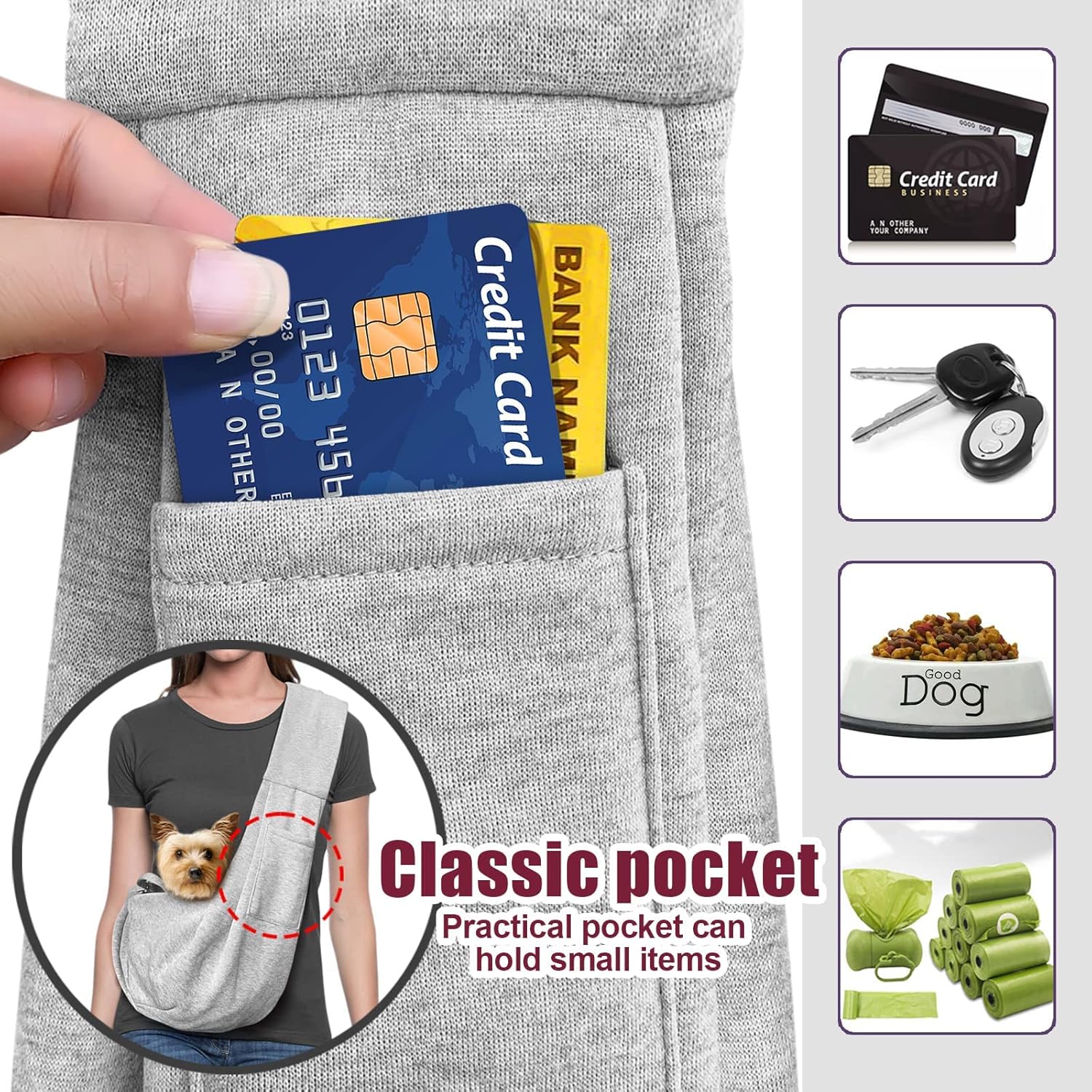 - FRONT POCKET: For your convenience,we design a front pocket to store your personal stuff,such as treats, poo bags, your wallet. And this is a additional front pocket , you would not feel the things inside of the pockets press your shoulder.
