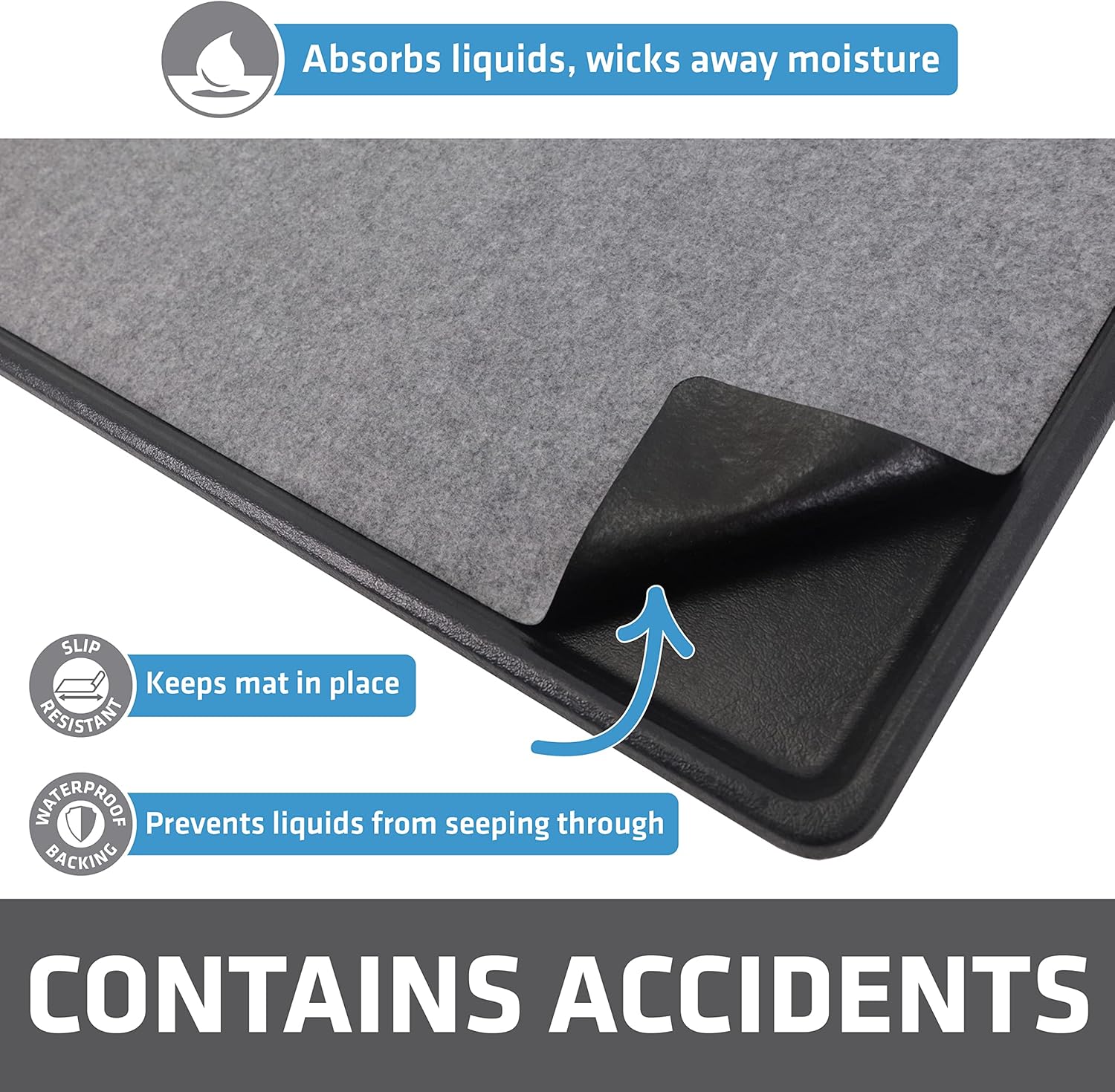 - CONTAINS ACCIDENTS & PROTECTS FLOORS: Drymate Dog Crate Mats are made with a thin yet absorbent material that contains urine inside kennels and provides a sure-footed surface for your pet’s paws (great for travel). Place under the crate to muffle sound and protect floors from scuffs and scratches. MULTI-USE: Can also be used as a reusable potty pad or cat litter mat.