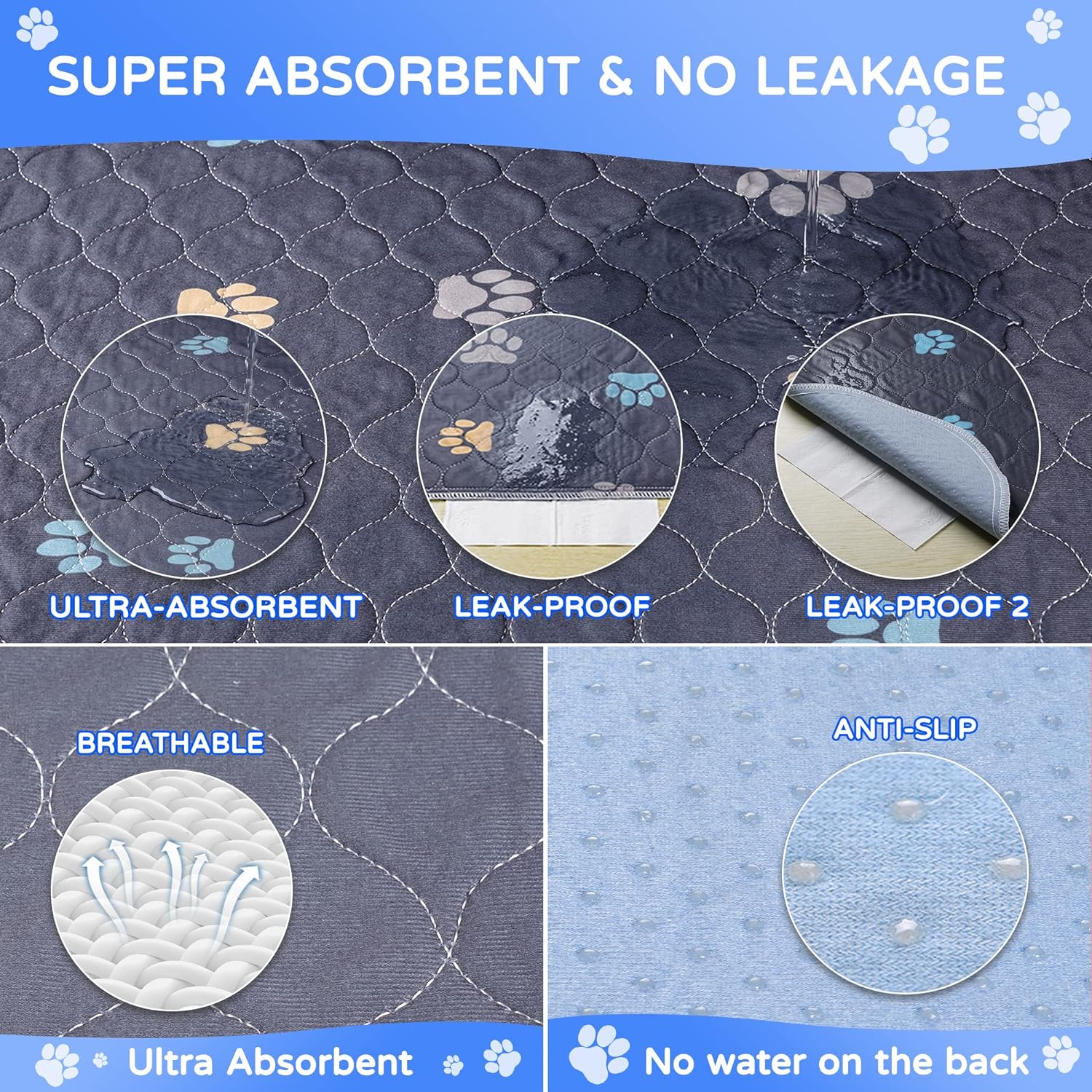 - [SKIN-FRIENDLY & ANTI-SLIP BOTTOM] Our washable puppy pads are made of comfortable cotton and PVC, composed of 4 thickened layers. Soft and breathable surface, strong absorbent and leakproof inner, and anti-slip bottom with gels. This anti-slip bottom helps the dog pads stay on the floor. Compared to disposable pet pads, It's an excellent choice to save money