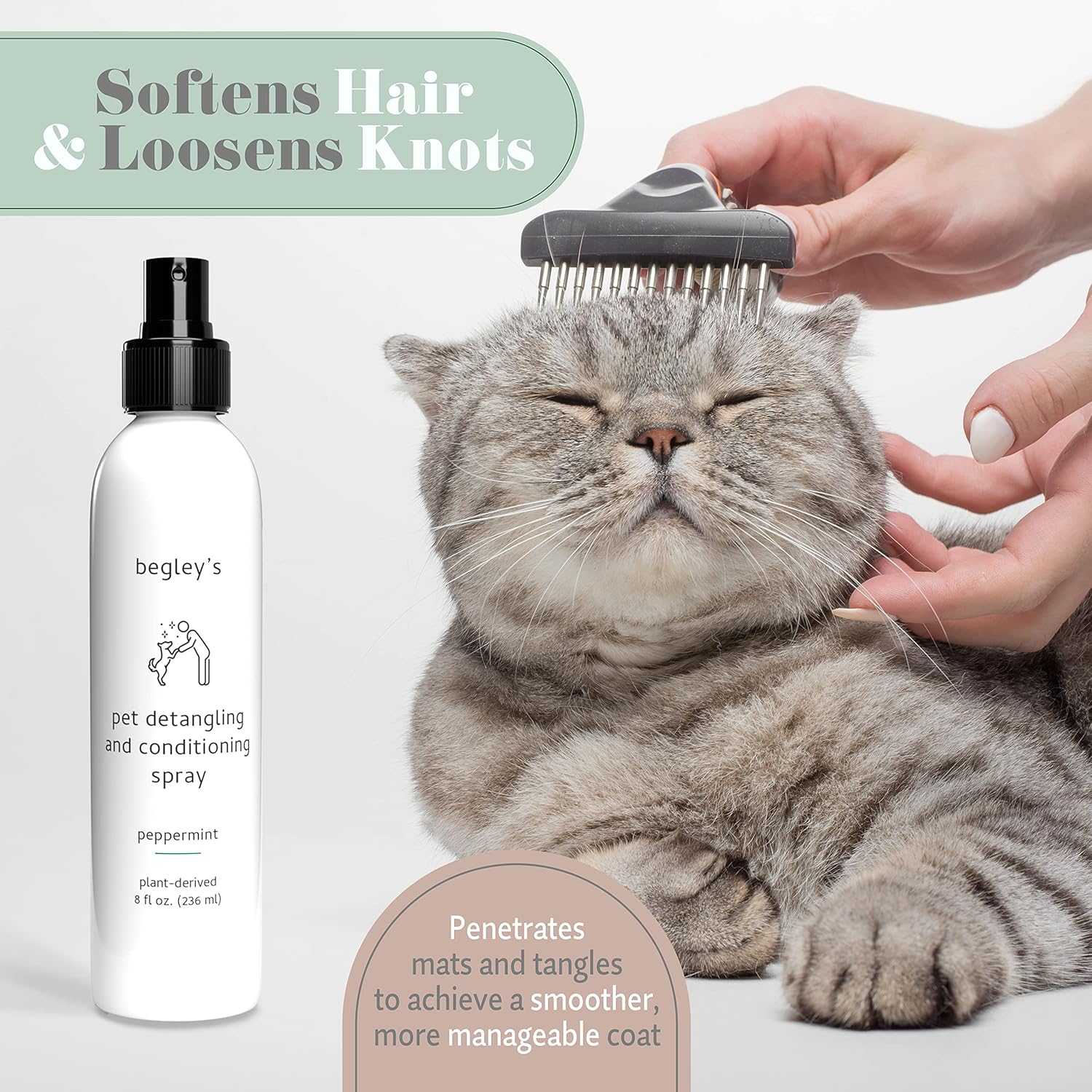 Begley's Pet Detangling Spray - Premium Essential Oil Scented Detangler Spray for Dogs, Puppies & Cats - Dog Leave in Conditioner Spray - Dematting Spray for Dogs & Pets - 8 oz, Peppermint