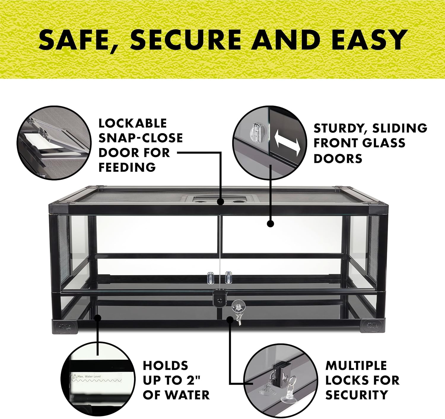 - Included Components : Terrarium, sliding front-opening doors, double hinged locking top screen, feeding port, water-holding base (optional), removable bedding tray (optional) Terrarium, sliding front-opening doors, double hinged locking top screen, feeding port, water-holding base (optional), rem… See more