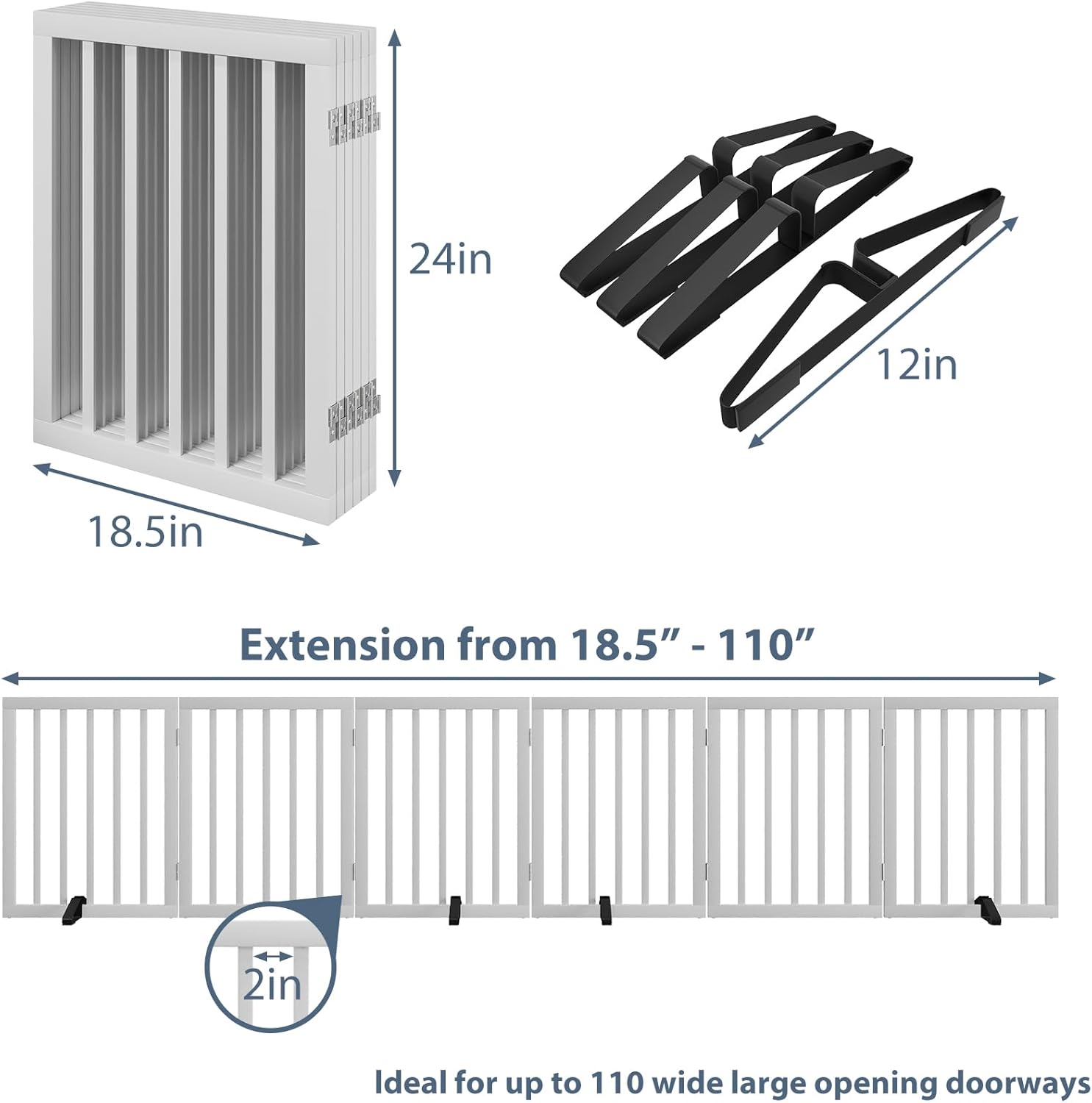 - Dog gates for doorways expands to fit large openings between 18.5-110 inches wide, when folded, the size of the dog gate: 18.5" x 4.2" x 24", fully expansion size is 110" x 0.7" x 24". Distance between poles: 2”
