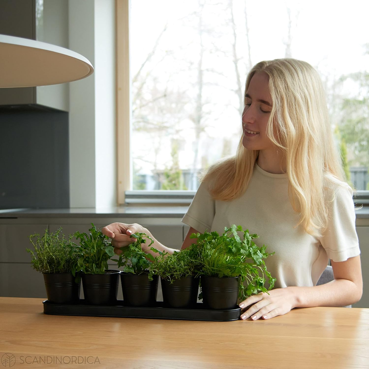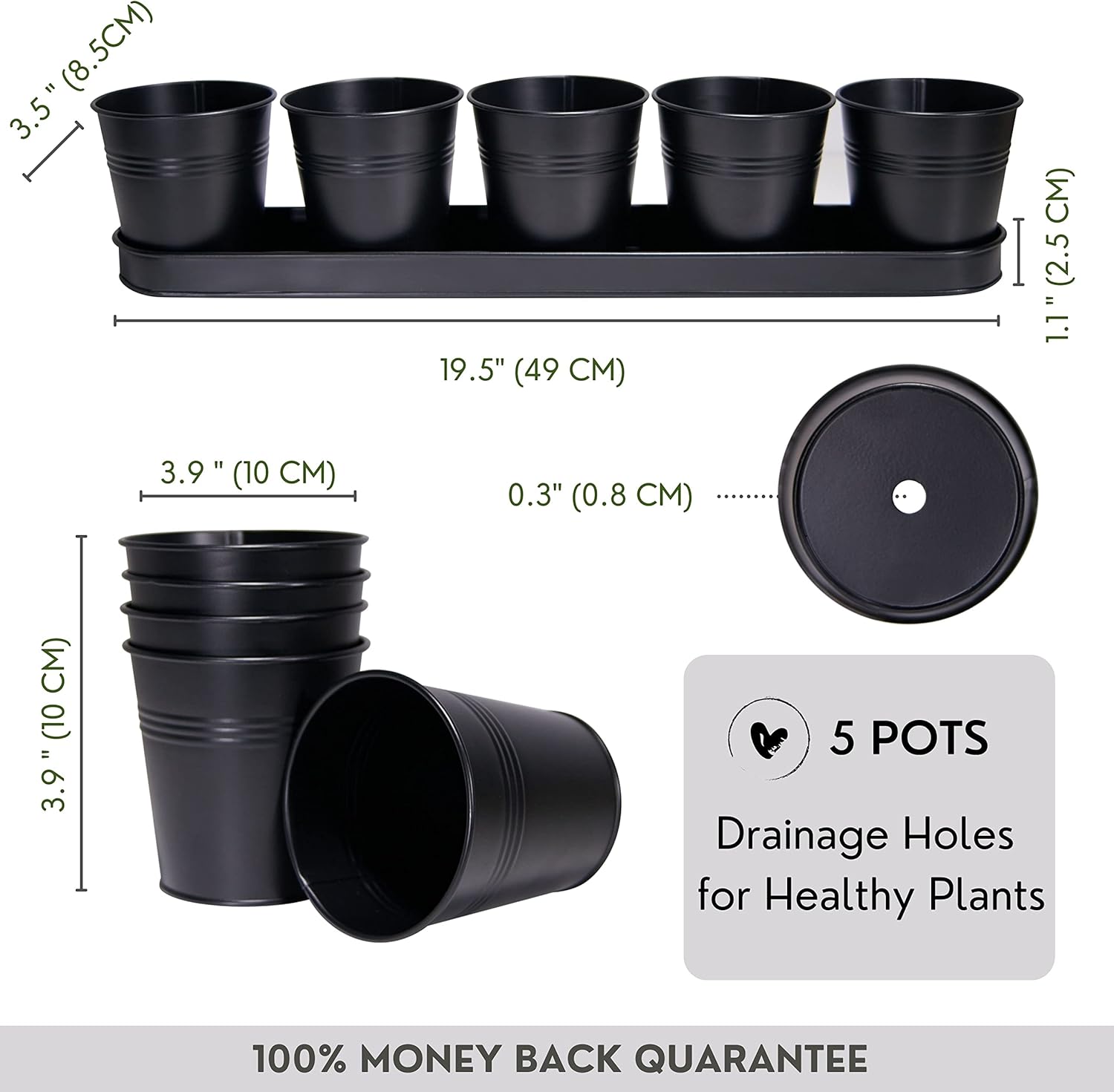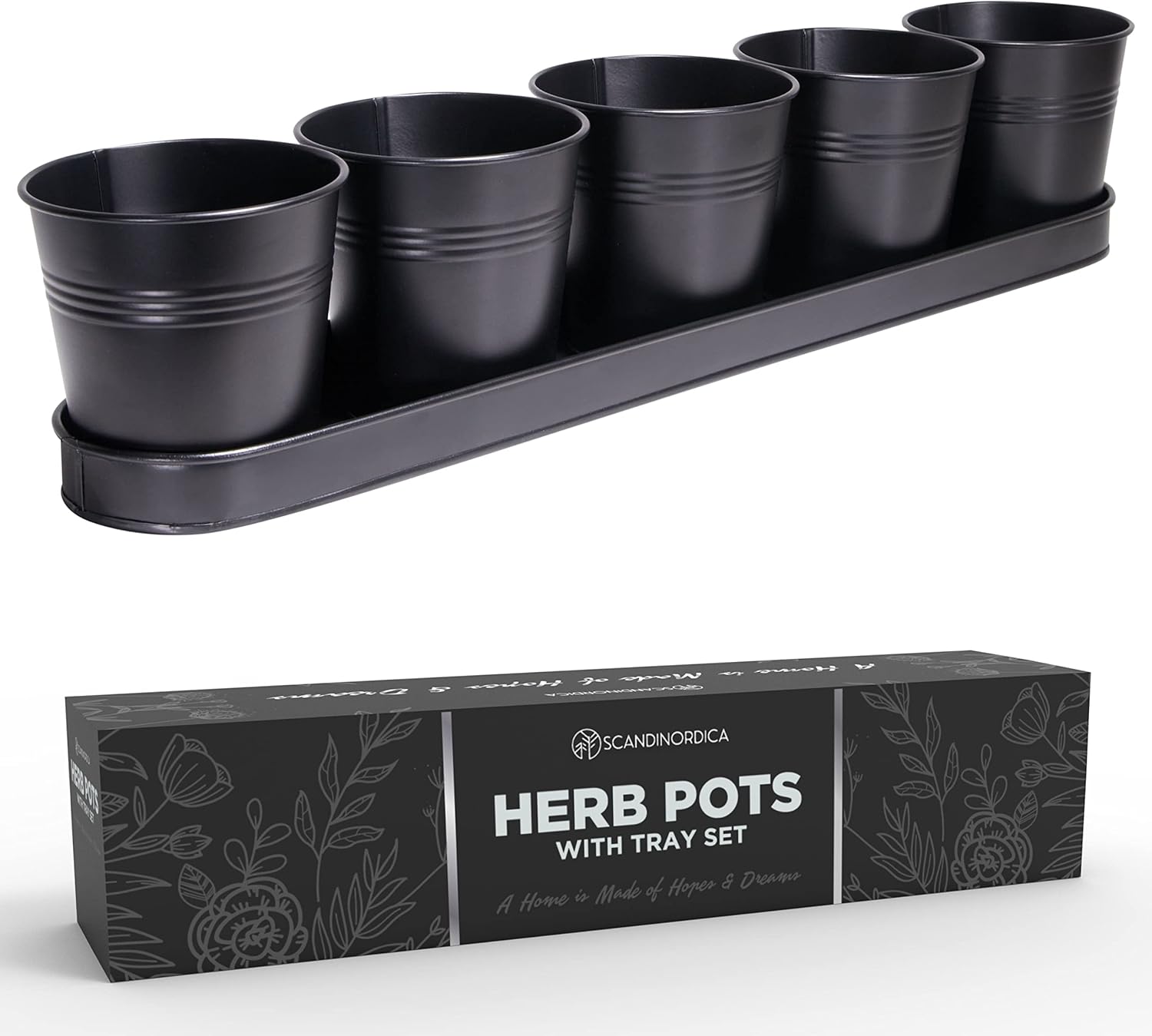 SCANDINORDICA Black Herb Planter – 5 Pots with Drainage Holes and Tray, Windowsill Planter, Herb Pots for Indoor Outdoor Plants | Kitchen & Garden Decor