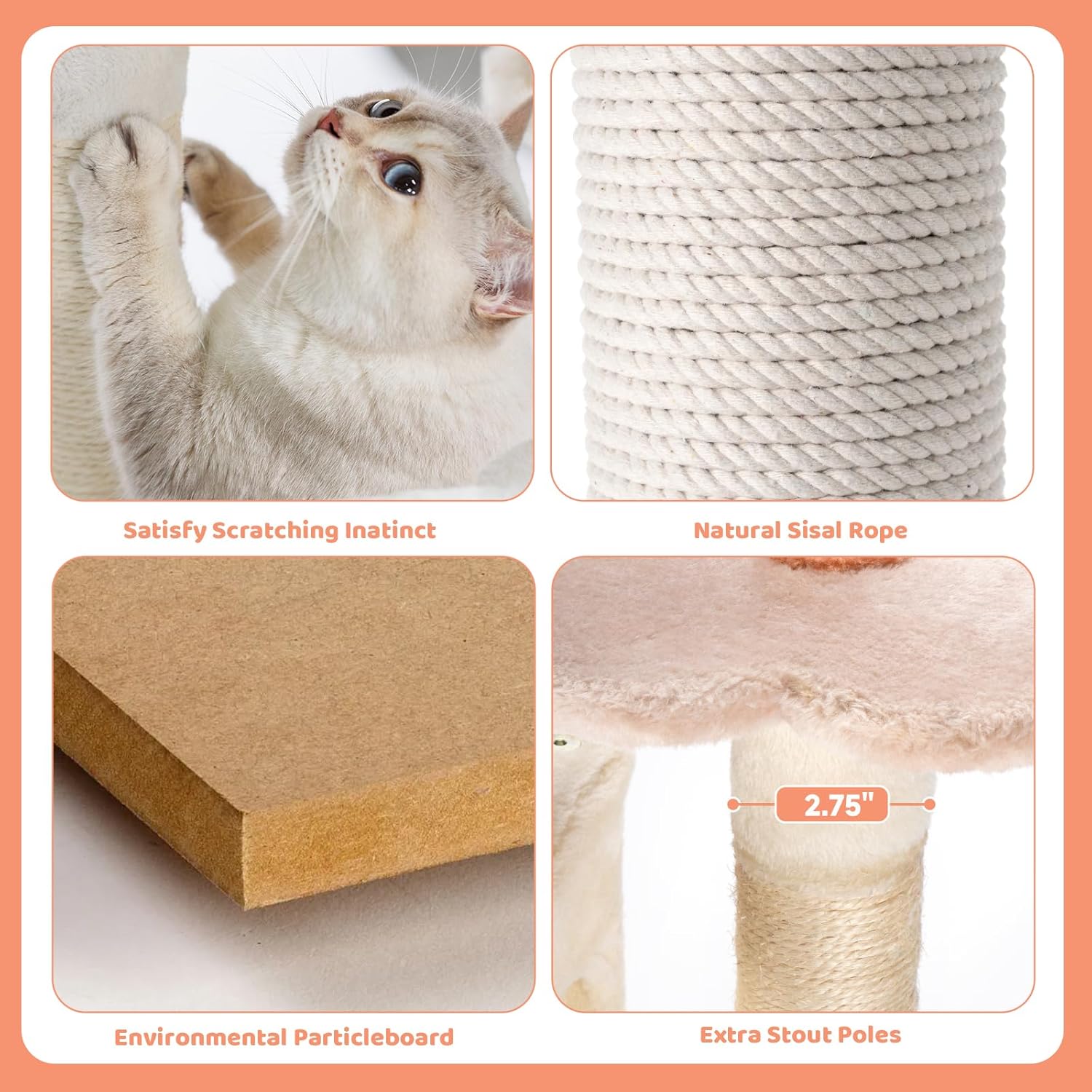 - Premium Materials: Made with CARB-certified P2 particleboard and covered in 400g skin-friendly plush, this cat furniture provides a comfortable and safe resting space for your furry friends. The 9-core 6mm sisal rope is more durable than regular sisal, and the natural jute fiber scratching posts help maintain healthy claws while protecting your furniture from damage.