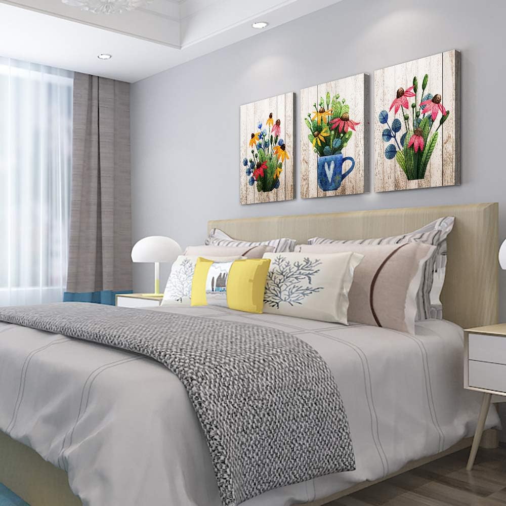 Vintage Wood grain plant flowers wall art for kitchen Wall Decoration for Living Room Wall decor for Bedroom room Decor 20" X 28" 3 Piece Framed Office Canvas print Artwork modern Home Decor painting