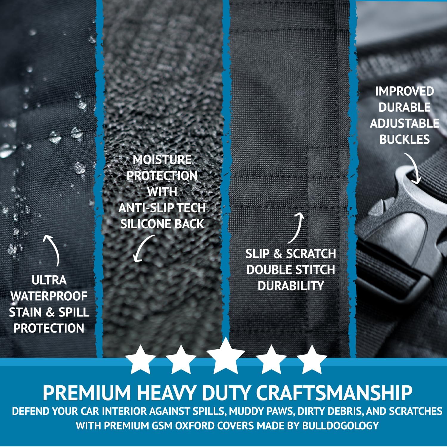 - Premium Quality: Bulldogology designed premium pet cargo seat covers that's modern and easily matches your vehicle interior. Each cargo cover is incredibly strong and padded with thick materials that’s made for long-term use. It is the ultra-protection cover while providing a more comfortable ride for you and your pets. Infused with Color-Fast layers preventing color bleeding, Free of AZO dyes, and can withstand extreme temperatures without damaging your vehicle.