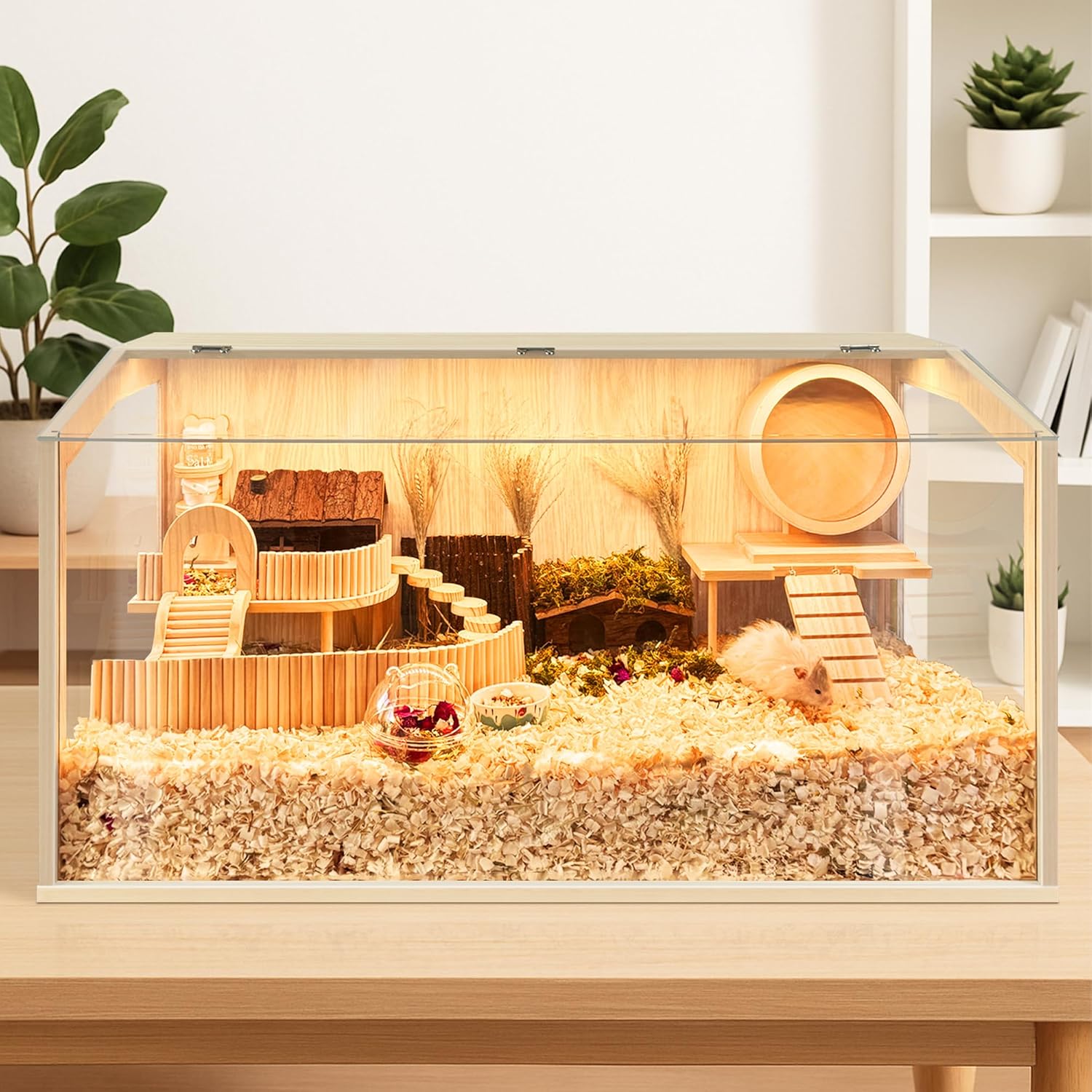 - 【Thick Bedding Matters】Research shows it’s best to have plenty of bedding so your hamsters can make a burrow just like they would in the wild. The extreme large interactive space of our cage is able to hold thick bedding and toy system for your pets to dig and explore. It's easy to arrange their hideout, sand bath area, hamster wheel, or exploring scene in the cage, which results in a far happier and less stressed hamster compare to the wire cage. We offer 4 different sizes, feel free to choose from 24-48in length. Note: The inner decoration is not included in the package