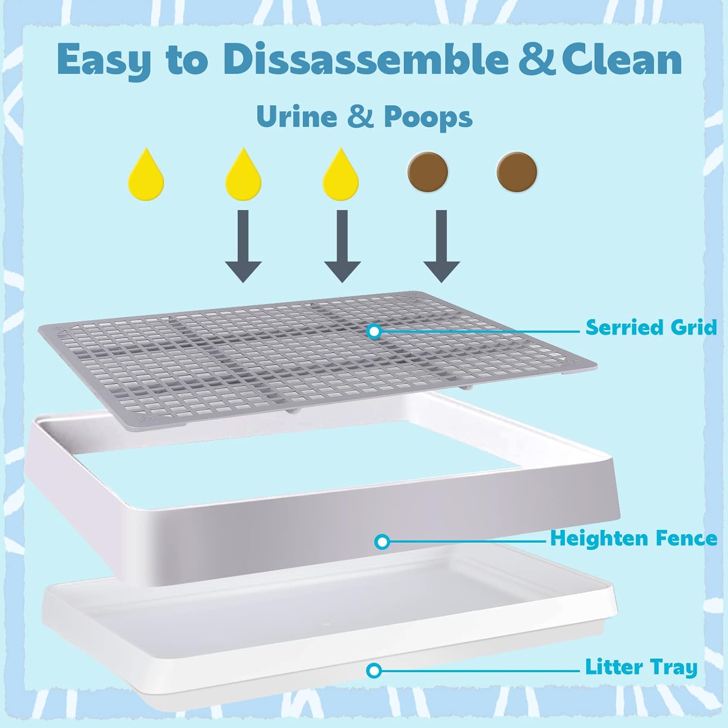 - Guinea Pig Toilet in Grid Design: The right size mesh of 0.39 x 0.39 inches ensures that the pet's feet won't get stuck in the rat litter box; And the serried mesh also enables the excrement and pee to be fully exhaust to the hamster litter box bottom,avoid getting their feet dirty and unhygienic things cause illness