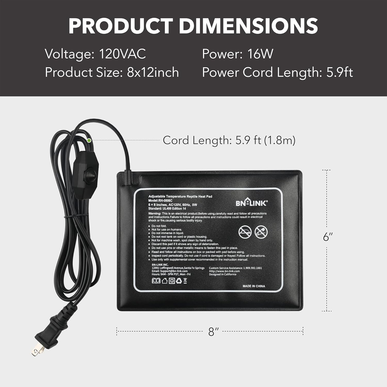 - MADE FOR REPTILES: Voltage: 120 volt, Power: 8 watt. The 6" x 8" with adjustable knob model is perfect for a 10 -20 gallon terrarium and it can easily put out steady heat between 104โ and 122โ. Each unit comes with BN-LINKโs strong 15-month warranty.