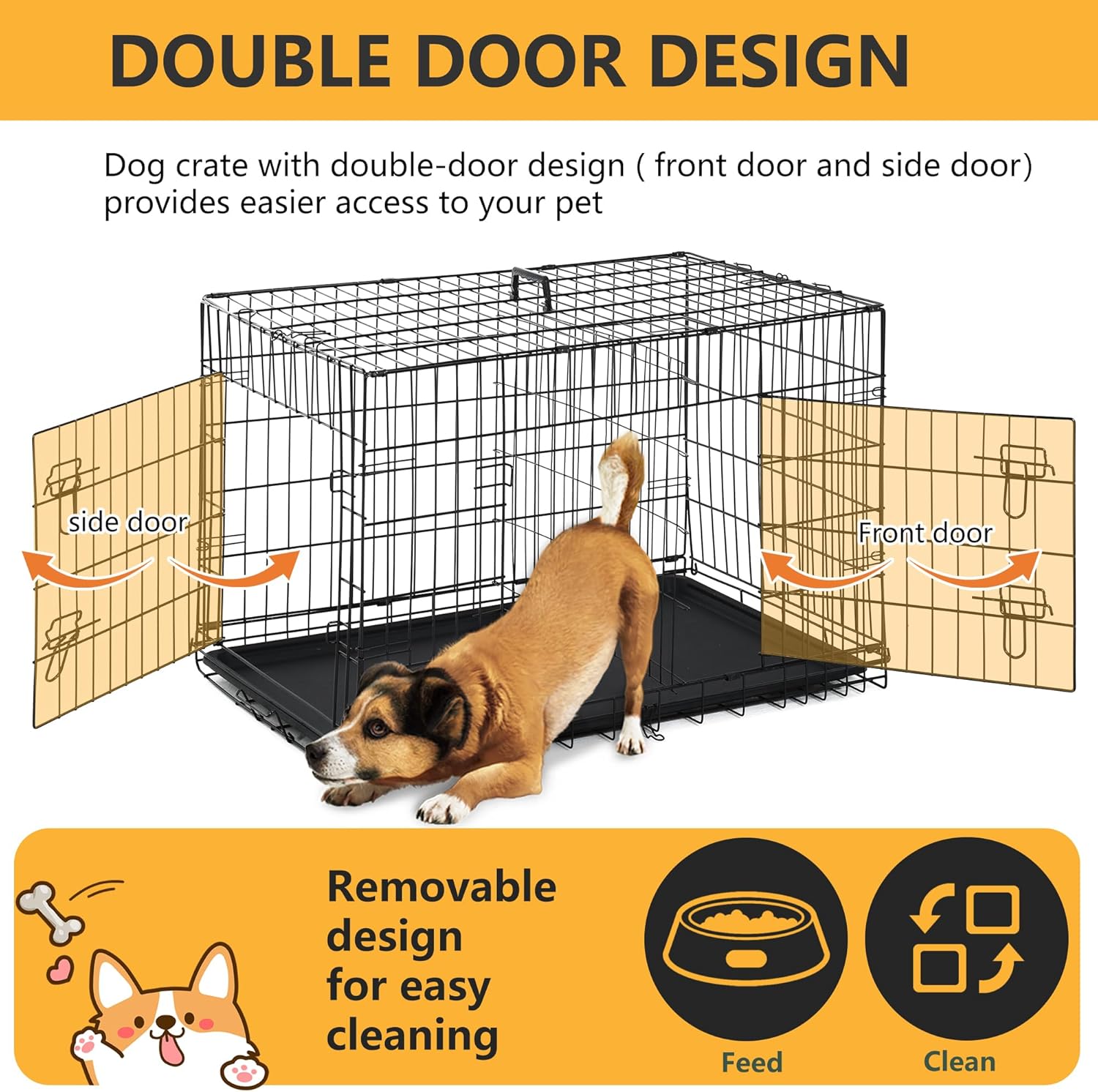- 【Double Door Convenience】There are two ways to enter our dog crate: the front entrance and the side door. Numerous ways to enter and exit this dog kennel are available. When putting the crate in confined areas where a front door can be blocked or for anxious dogs who might prefer a side entry, this is really useful.Dog cage dog crate dog kennel
