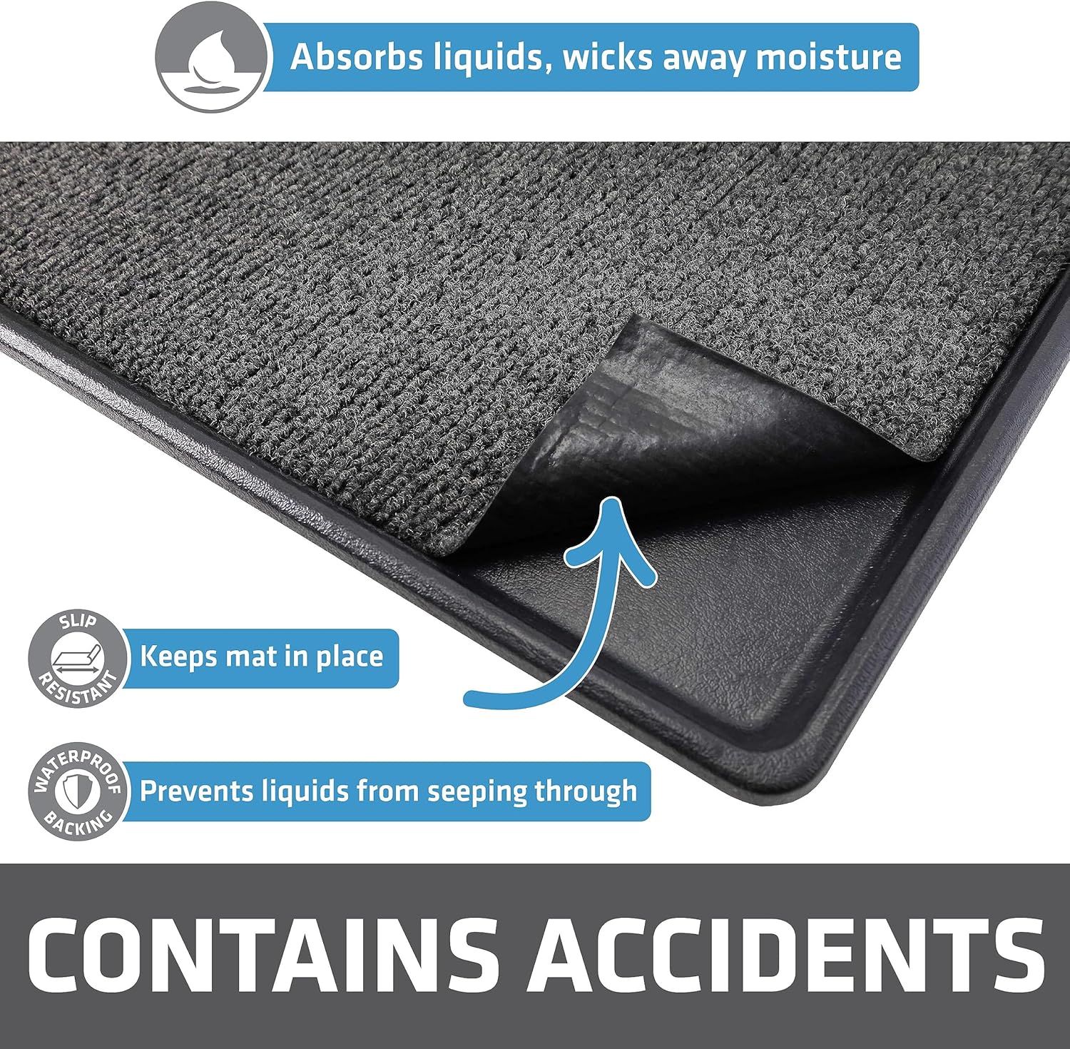 - CONTAINS ACCIDENTS & PROTECTS FLOORS: Drymate Dog Crate Mats are made with a thin yet absorbent material that contains urine inside kennels and provides a sure-footed surface for your pet’s paws (great for travel). Place under the crate to muffle sound and protect floors from scuffs and scratches. MULTI-USE: Can also be used as a reusable potty pad or cat litter mat.