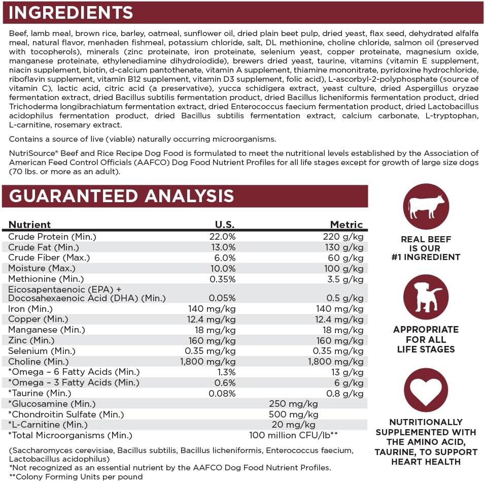- As a member of our grain inclusive series, NutriSource Beef and Rice Dry Dog Food is formulated to meet AAFCO guidelines for all lifestages