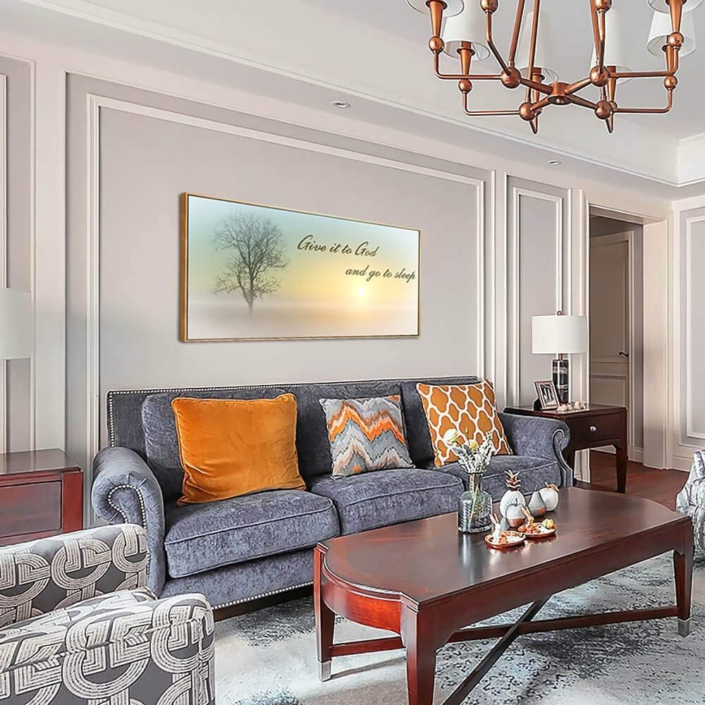 Lasdel Natural Extra Framed Wall Art of Misty Sunset & Tree Plant Picture For Bedroom Home Above Bed,Large White Country Wood Sign For Bathroom,Give It To God & Go to Sleep Artwork Decor,24x48