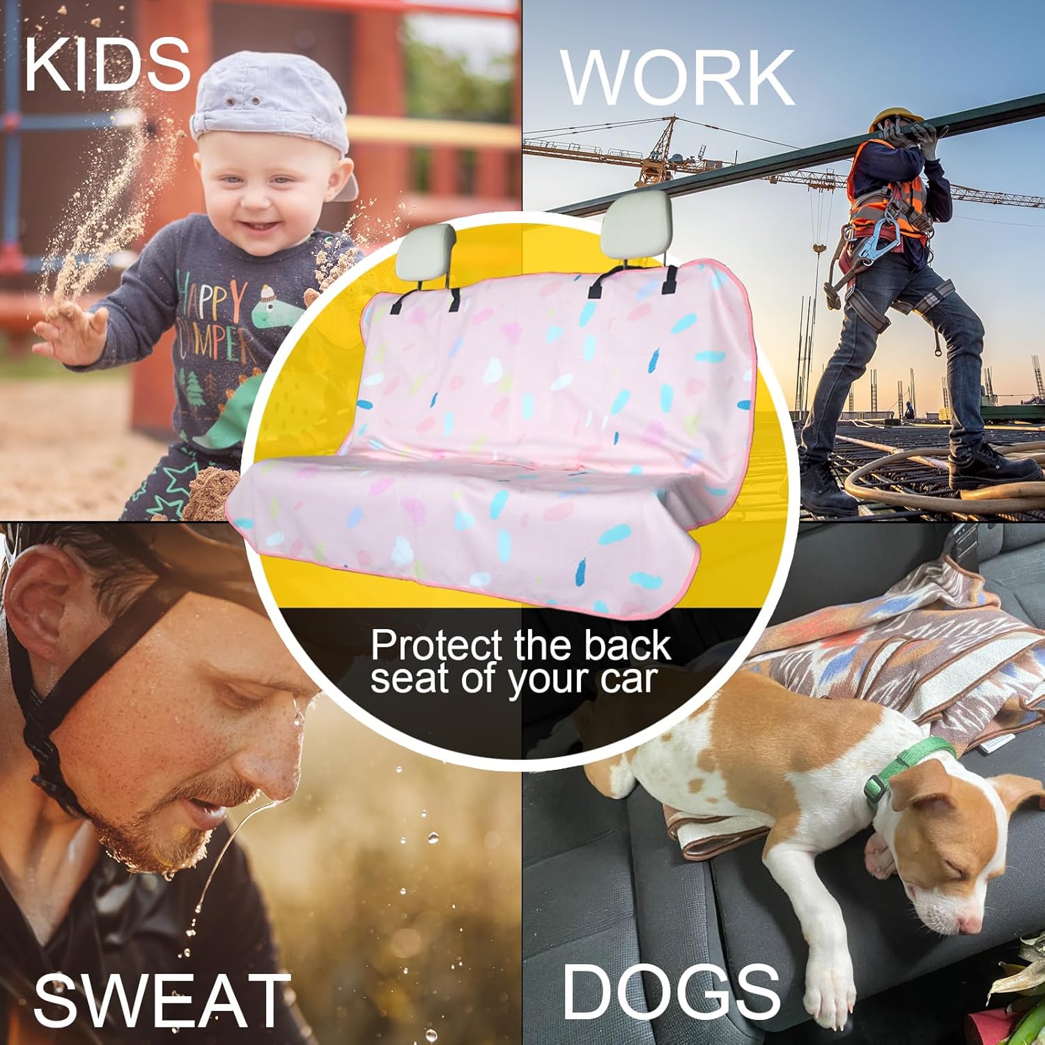 - Made From 3 Layer Material: (Front) Pink marbling pattern printed on towel cloth, which gives the rear seat cover a good look and a super long life. It is perfect for leather or upholstery back seats. (Middle) Waterproof fabric that is designed to guard your backseat against moisture and sweat. (Back) This rear seat cover are designed with a non-slip backing fabric that's super comfortable and won't slip off your back seat.